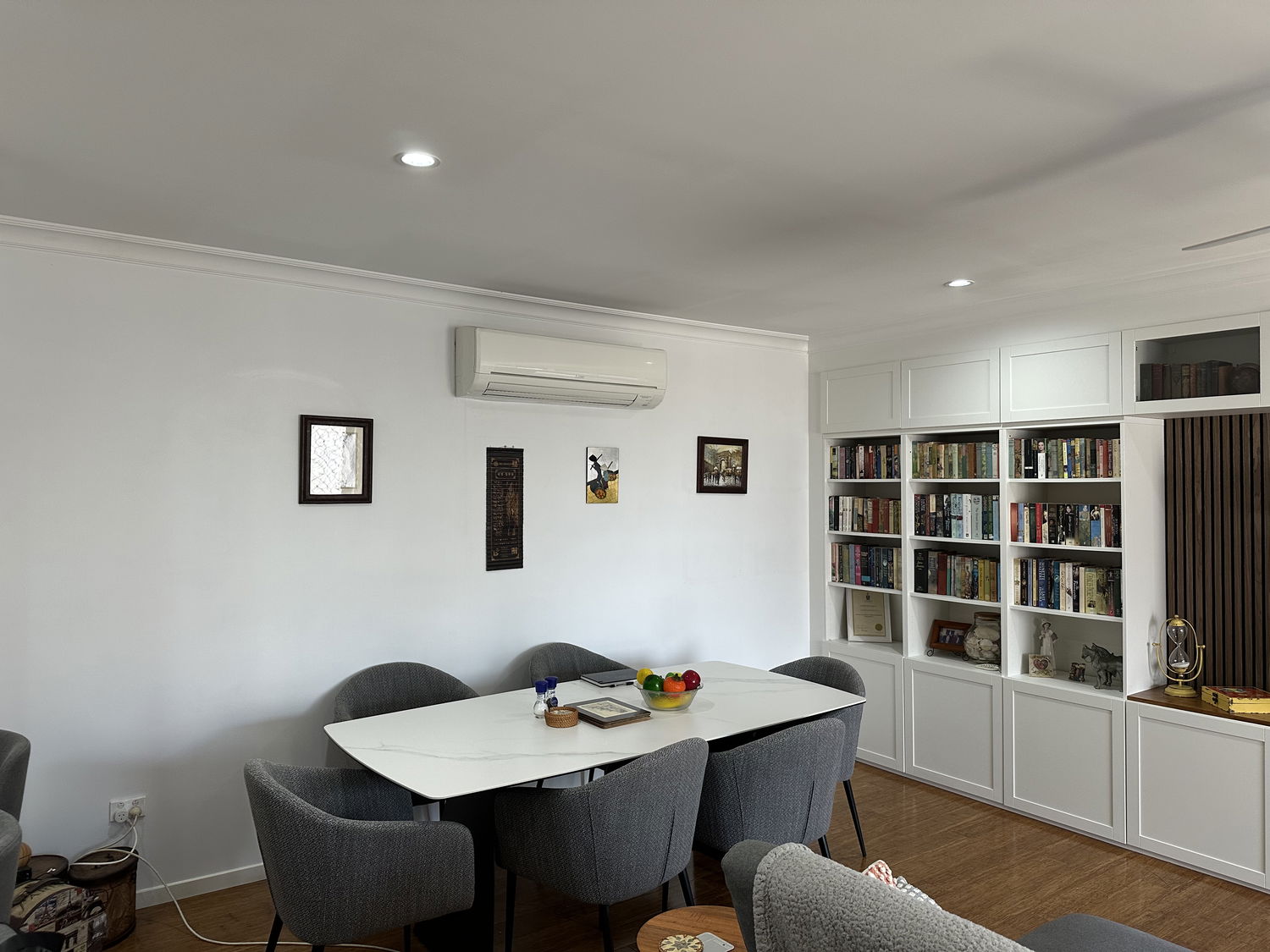 # Air-conditioned, light-filled living area with bamboo flooring and private deck with partial water views