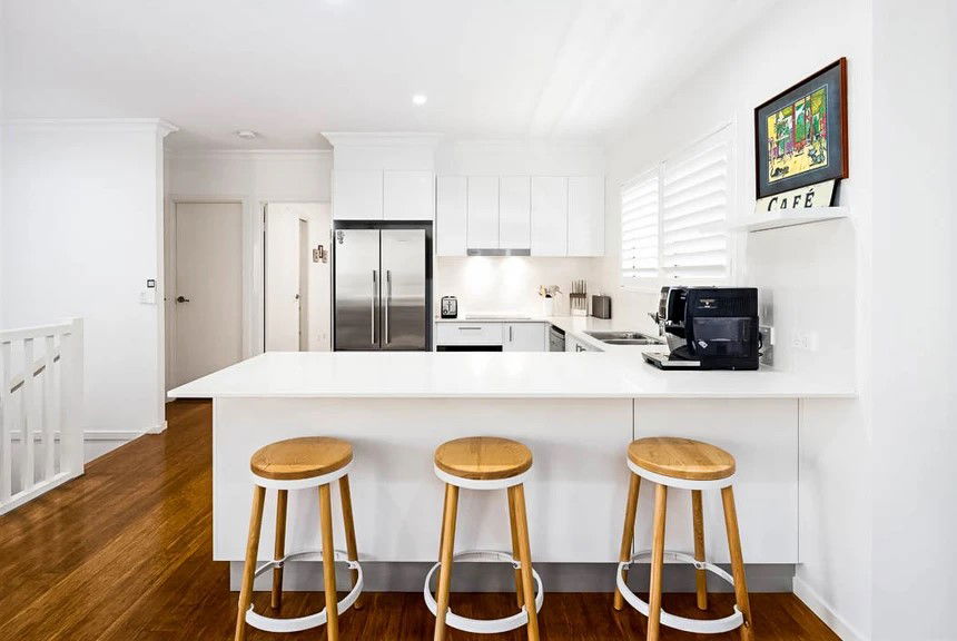 # Modern kitchen with Caesar stone benchtops, European induction cooktop, stainless steel appliances, and breakfast bar