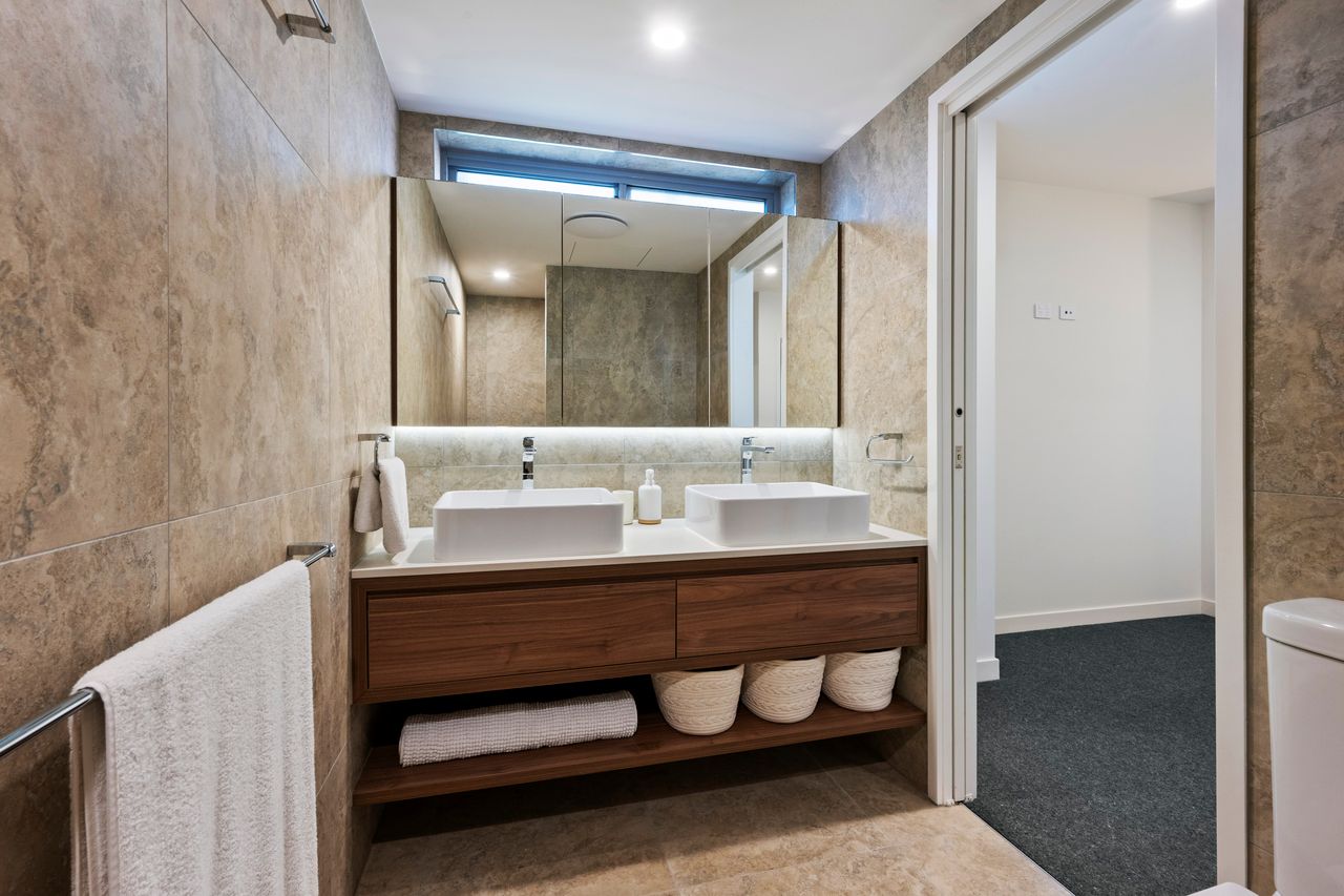 # Designer bathrooms with floor-to-ceiling porcelain tiling and premium fixtures