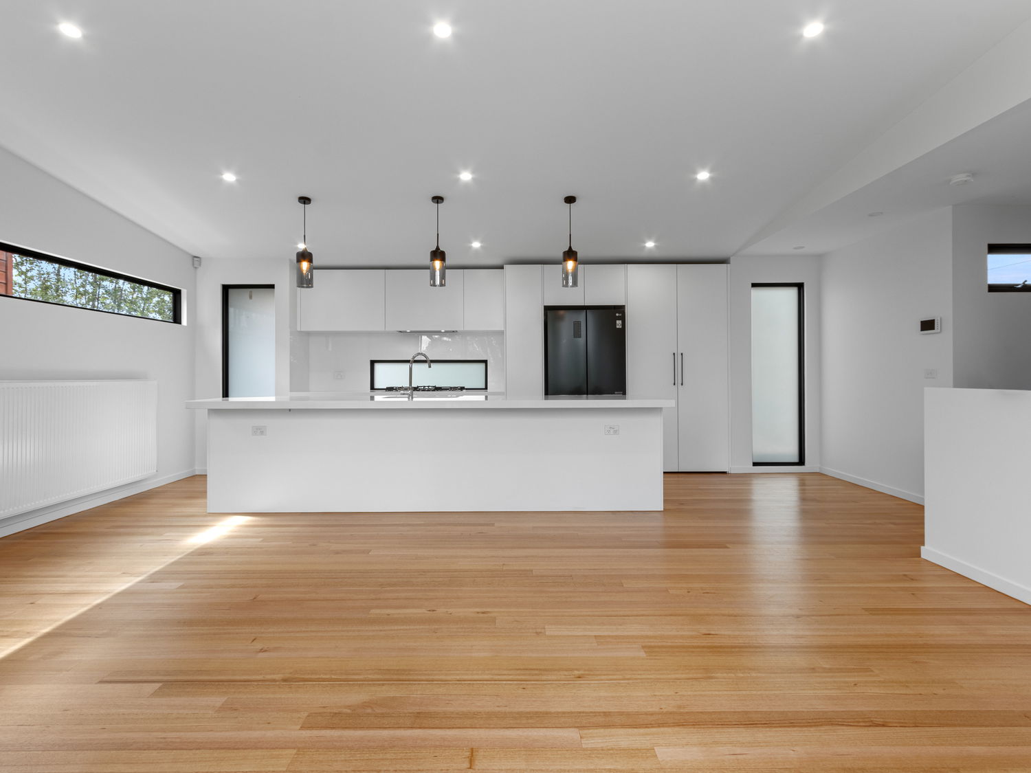 Expansive open-plan living and dining zone flowing to: Private courtyard, covered balcony facing Gaudion Reserve