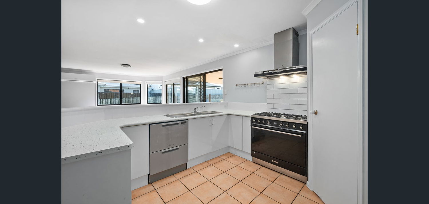 # Modern kitchen with appliances inclusive of dishwasher, rangehood & freestanding 900m gas cooktop and oven. Large sized fridge cavity, plenty of storage to cupboards and ample bench space.