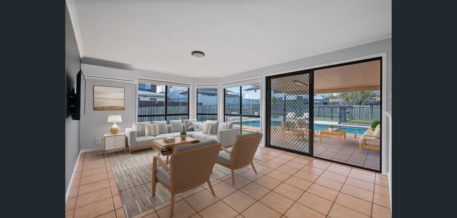 # Adjoining the kitchen is additional living spaces with air-conditioning, opening out to the covered alfresco and overlooking the pool.
