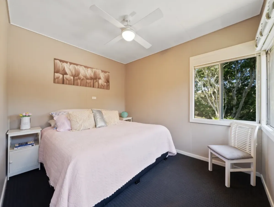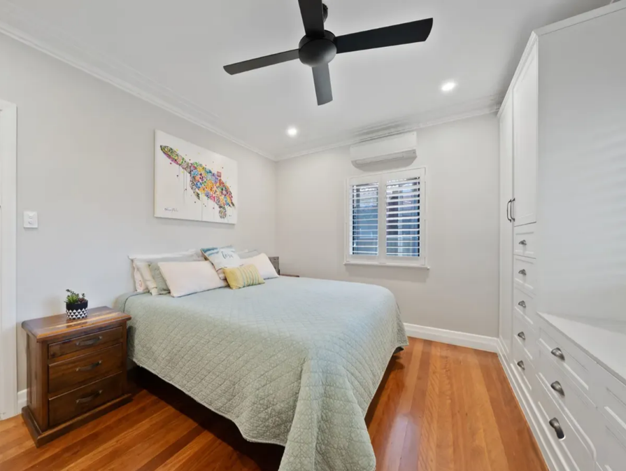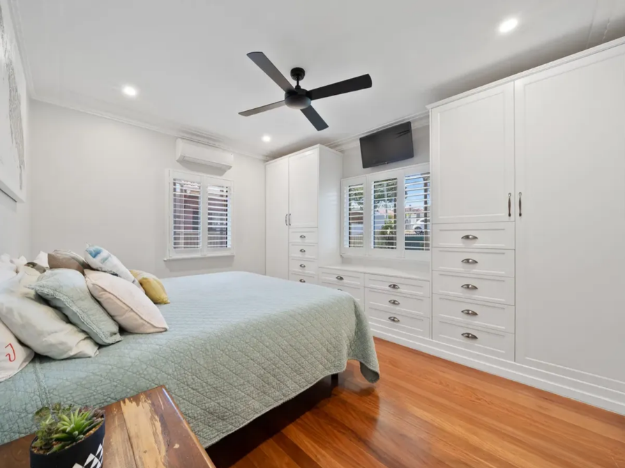 # Main Bedroom with air conditioning, ceiling fan, plantation shutters, built-in wardrobes and drawers