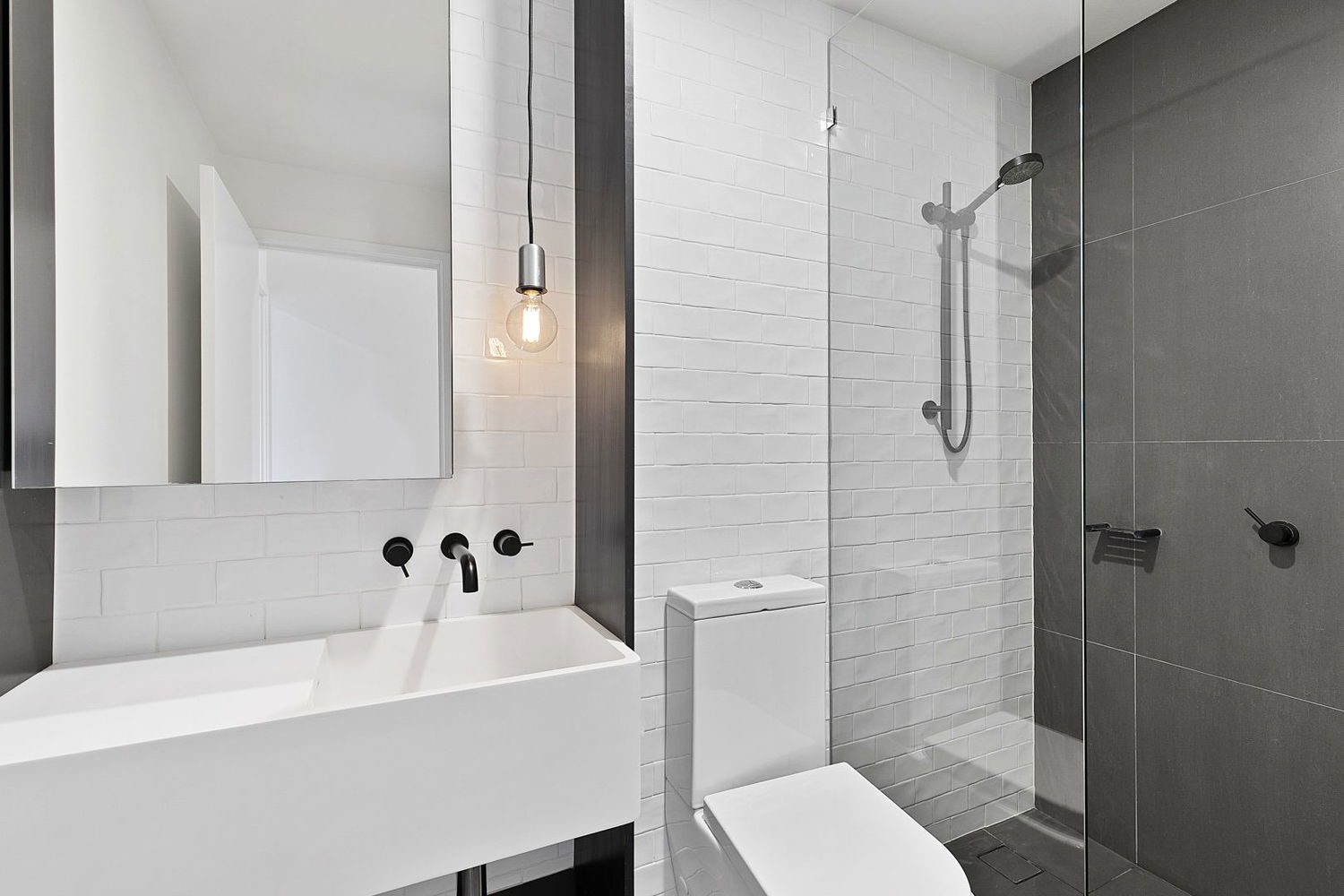 # Well designed bathroom, with matte black finishes and plenty of storage