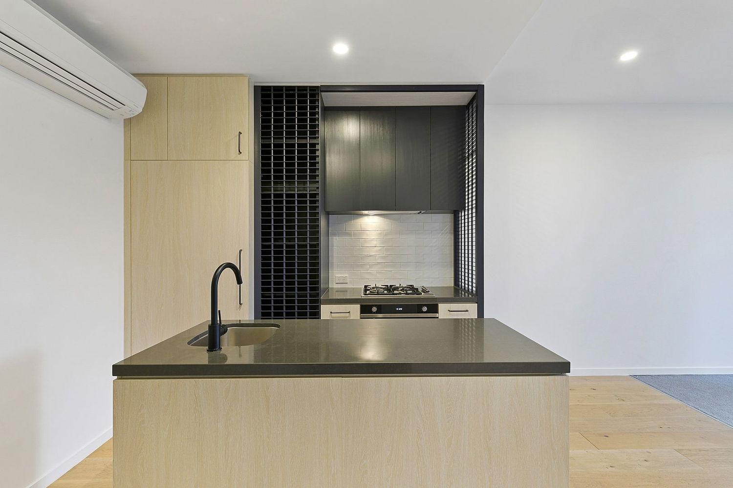 # Spacious kitchen with ISLAND BENCH SPACE and matte black fixtures, as well as dishwasher and GAS COOKING
