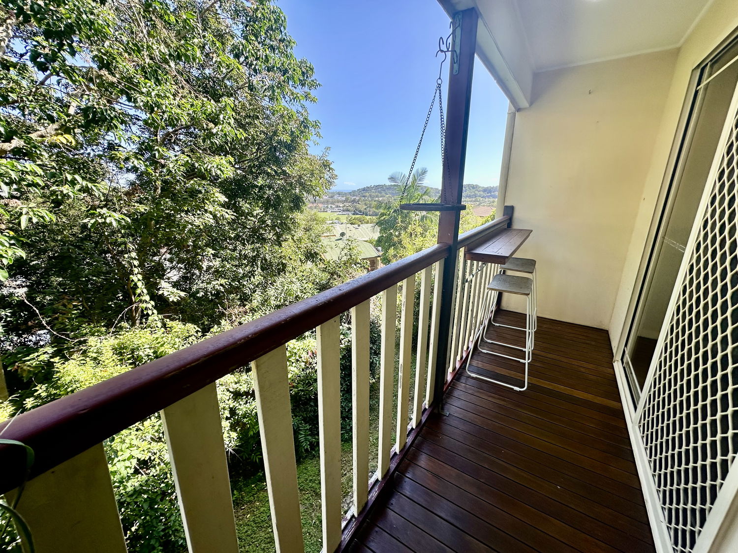 This three-bedroom townhouse is positioned in a quiet complex at the end of Hoffschildt Drive and enjoys elevated views across Currumbin from the main bedroom. Upstairs features include three bedrooms, all with ceiling fans, two with built-in wardrobes, a main bathroom with separate bath, and a separate laundry. Two parking spaces are also provided.