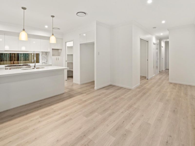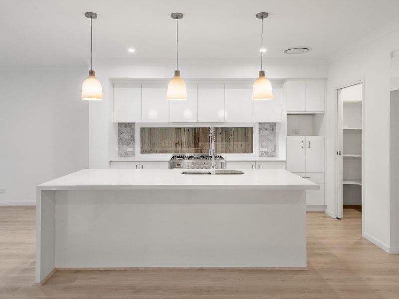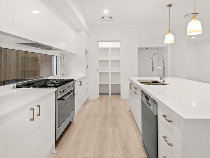 # Modern kitchen with STAINLESS STEEL appliances inclusive of DISHWASHER, oven and rangehood. AMPLE STORAGE to cupboards & drawers & AMPLE BENCH SPACE with ISLAND BENCH DOUBLING AS BREAKFAST BAR. Well-sized fridge cavity & WALK-IN PANTRY.