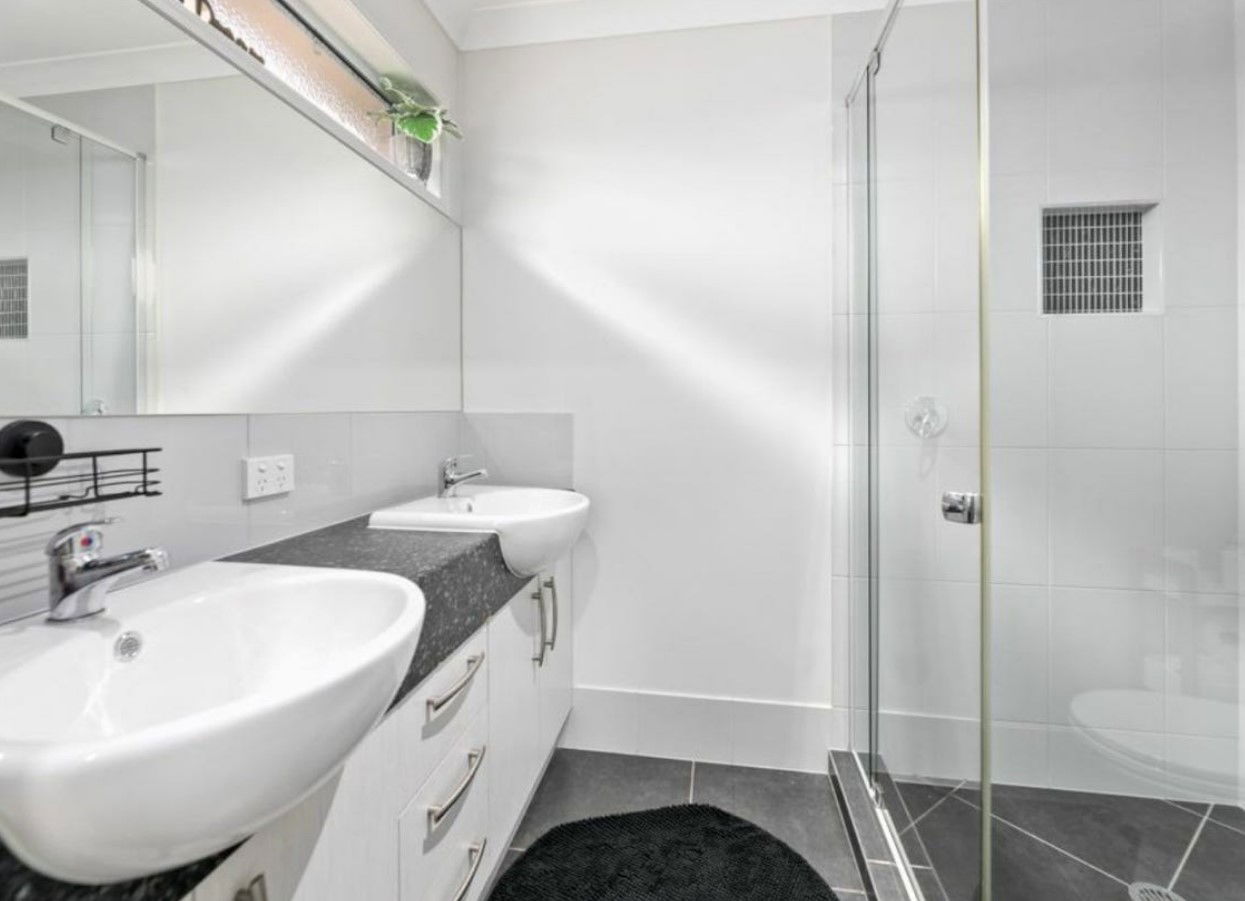 # Large ensuite with shower, double basin sinks, storage to vanity and toilet.