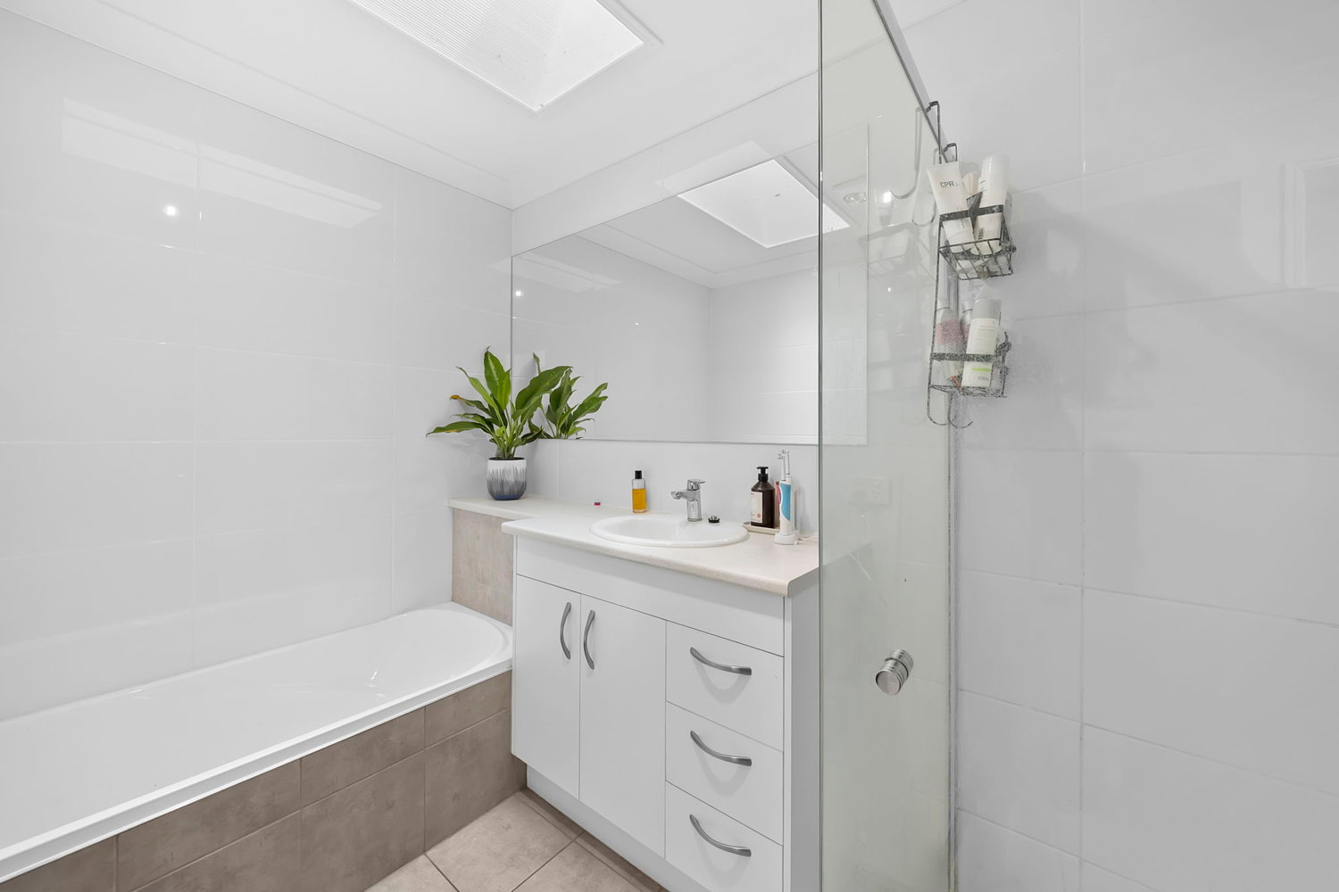 # Refurbished bathroom with modern vanity, bath, shower and separate toilet