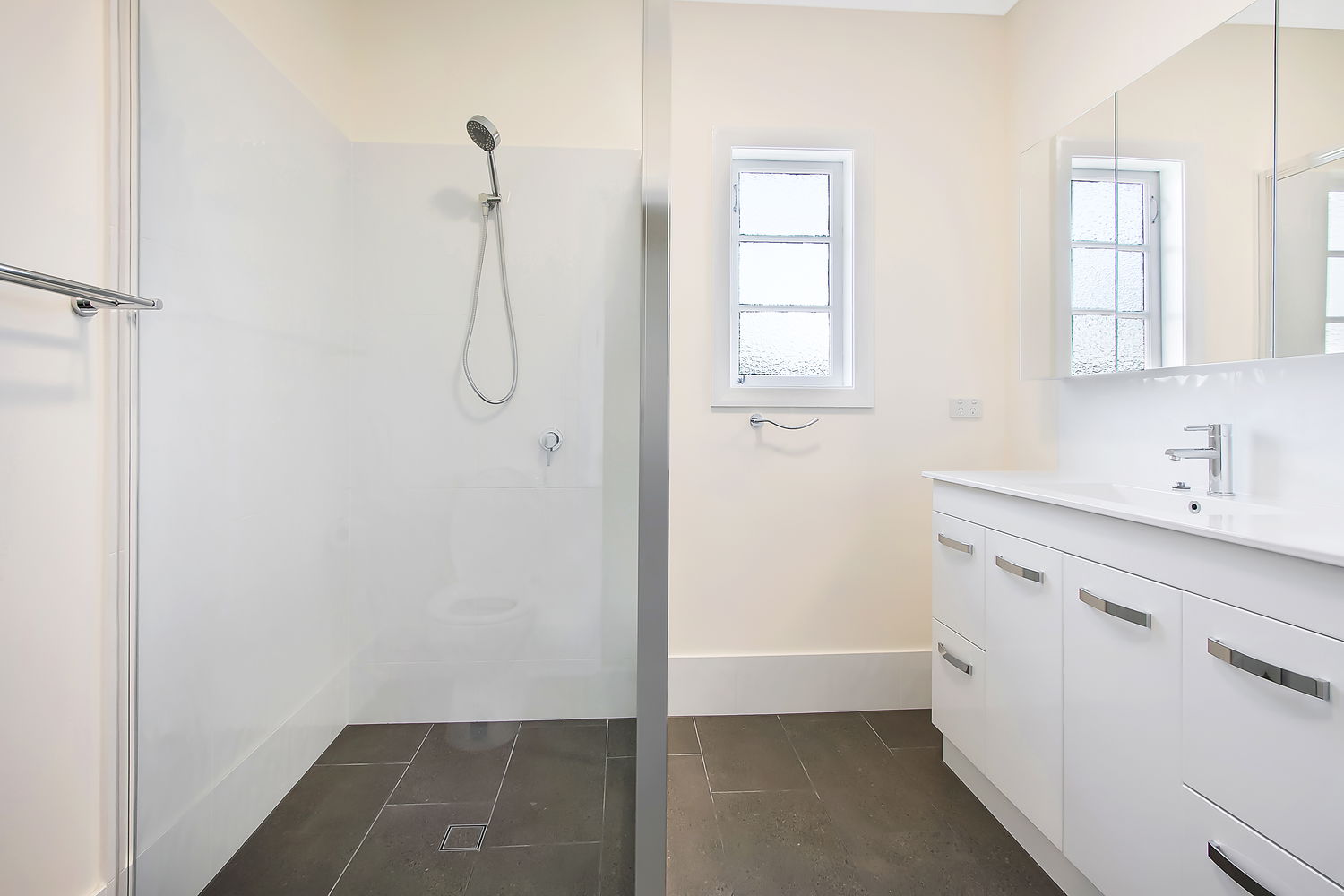 # Renovated main bathroom with double sized shower cavity, ample vanity space and storage!
