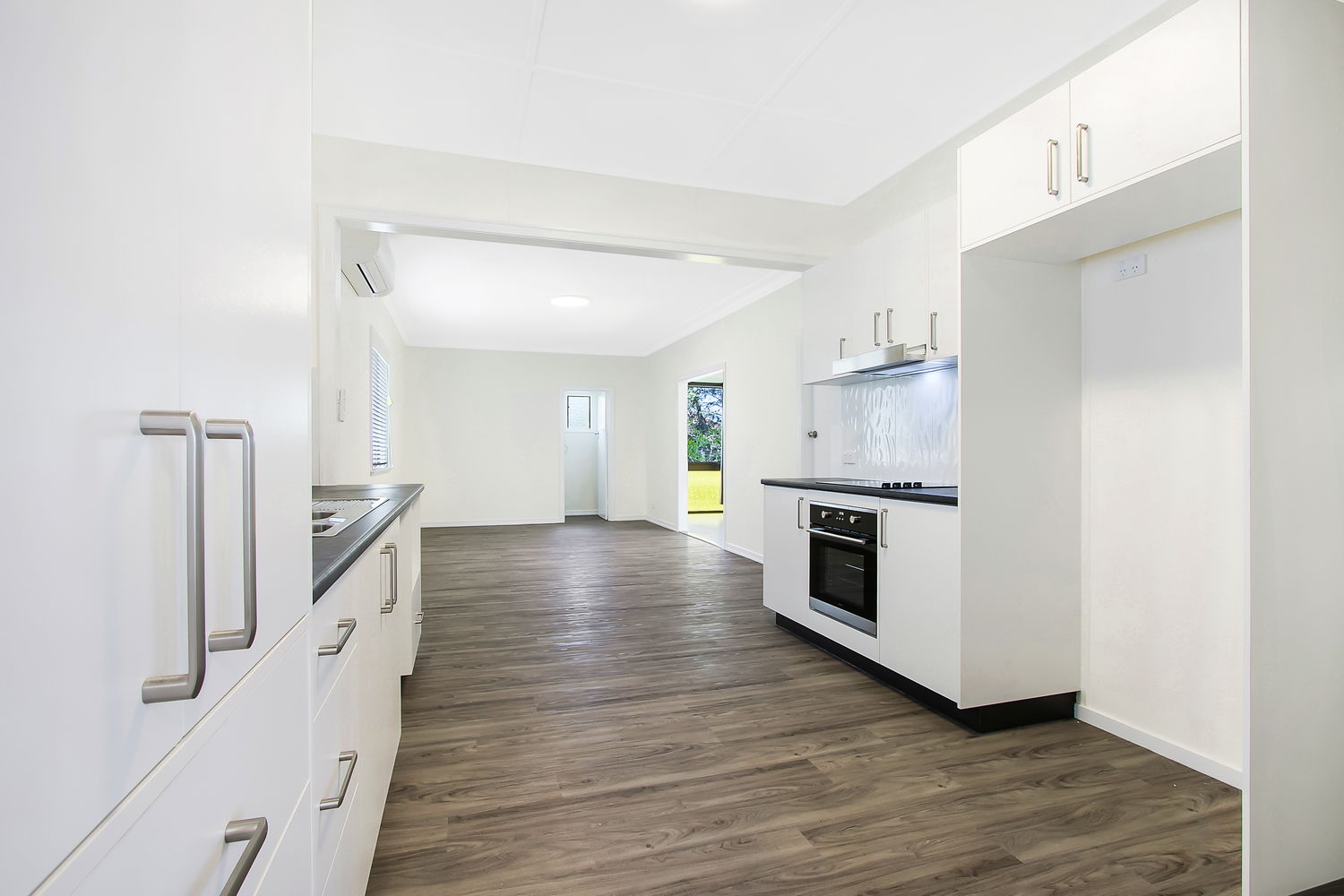 # Renovated open kitchen with modern timber look flooring, ELECTRIC COOK TOP, OVEN AND RANGE HOOD.