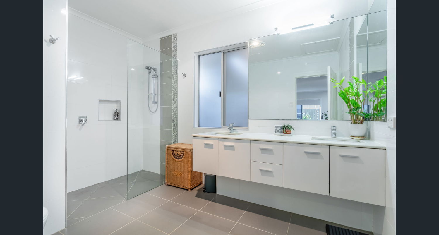 # Huge family bathroom with large shower toilet and storage to vanity.