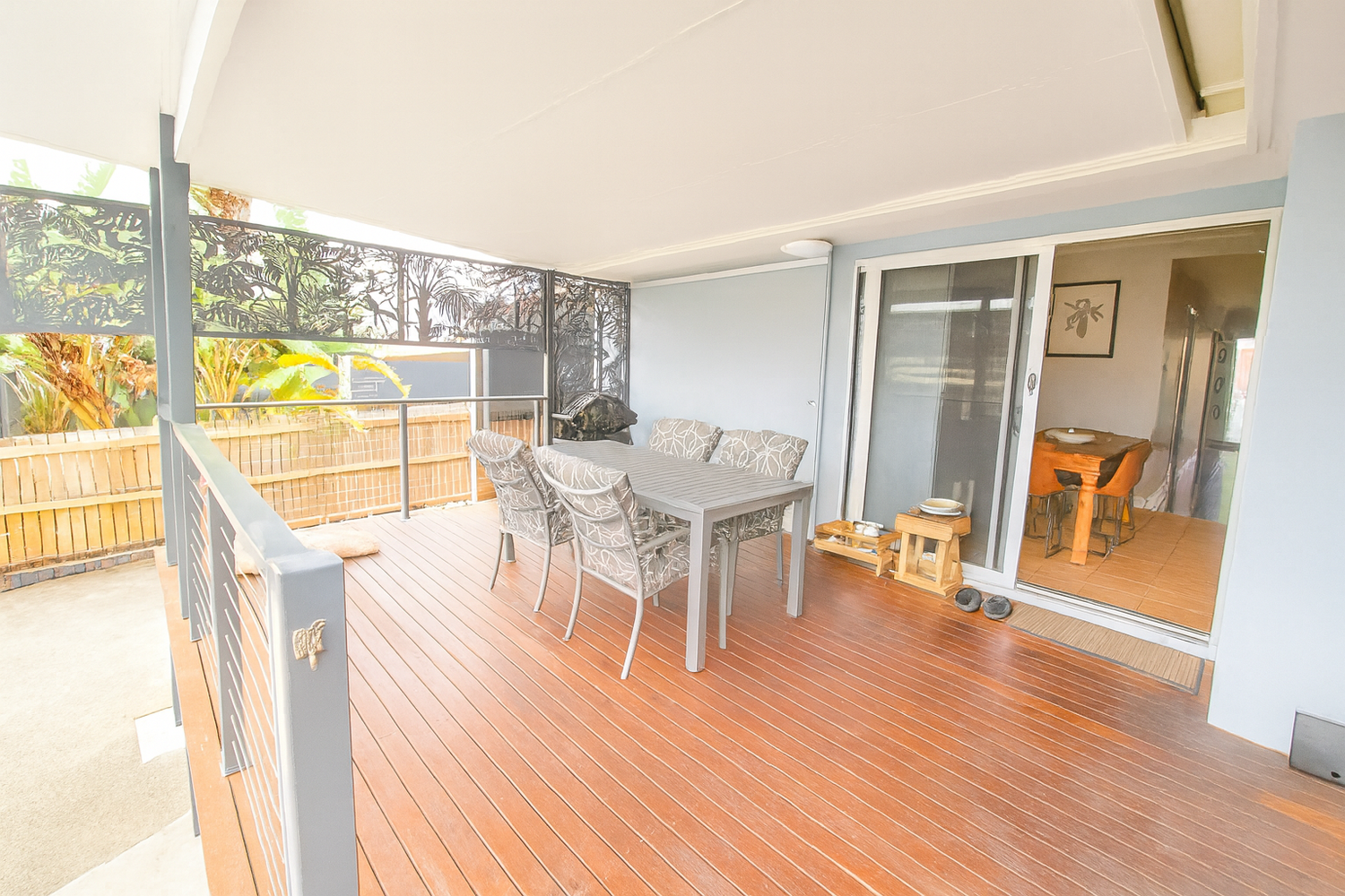 # Large, covered entertainer’s deck overlooking lush established gardens.