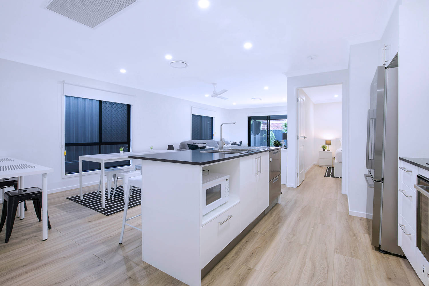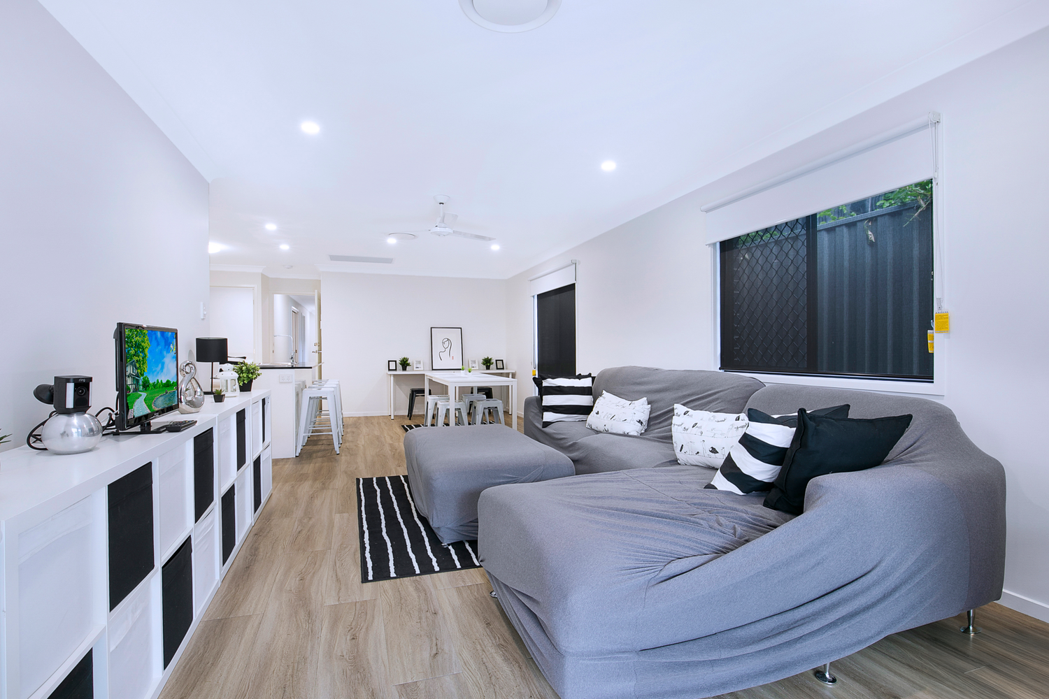 # Open plan living and dining with ducted air conditioning and ceiling fan. Sliding doors opening to covered entertaining area.