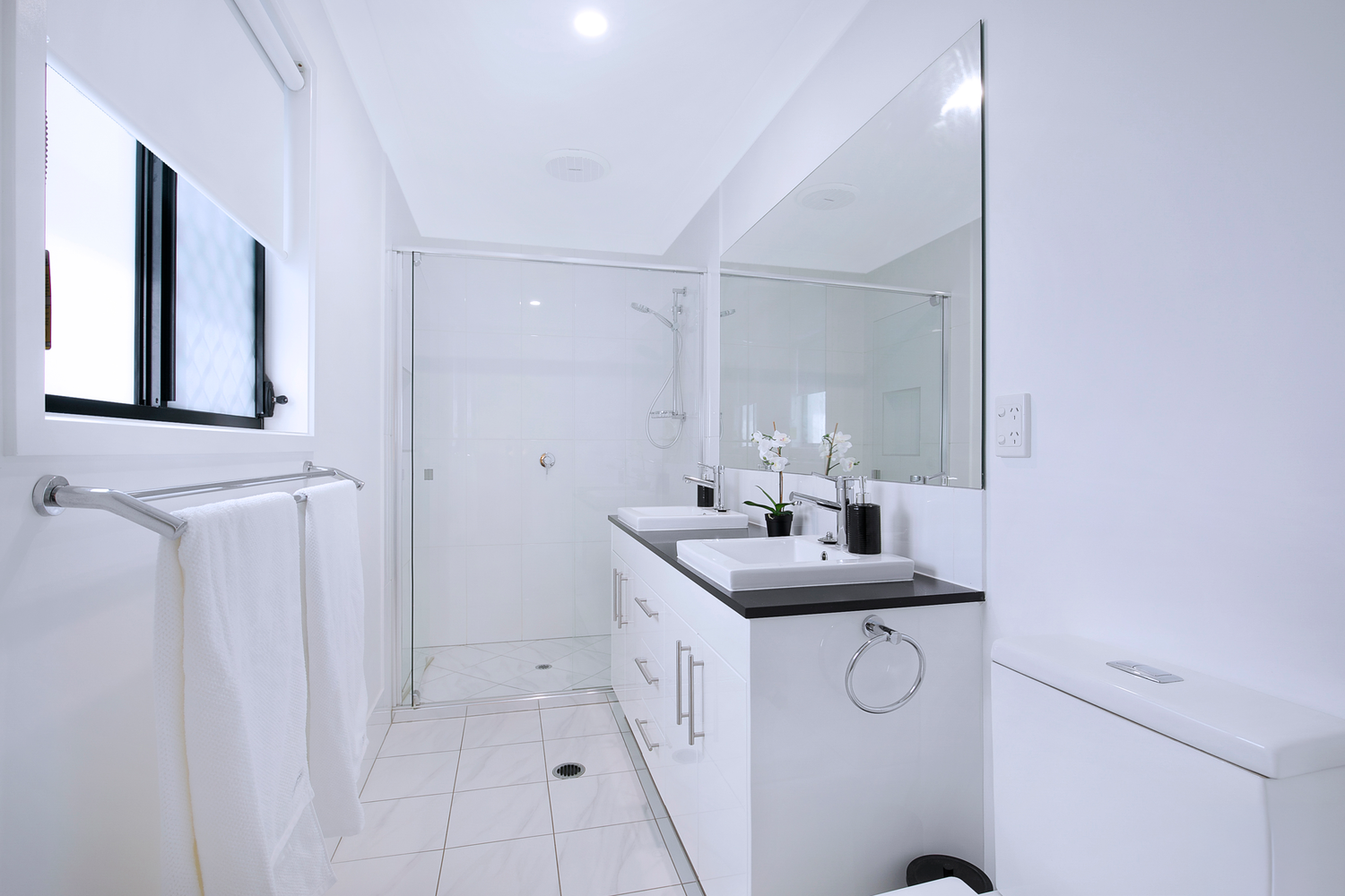 # Ensuite with large shower cavity, double basins, and ample storage to vanity.