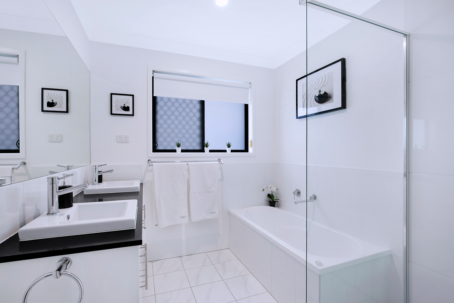 # Main Bathroom with double basins, ample storage to vanity, large shower cavity, and bathtub.