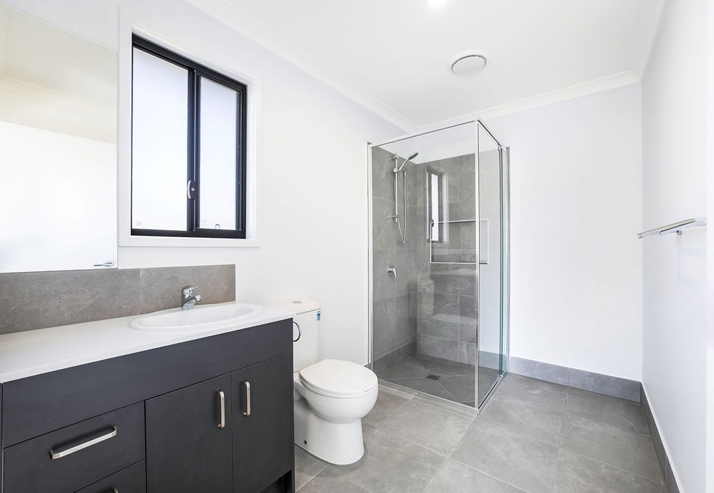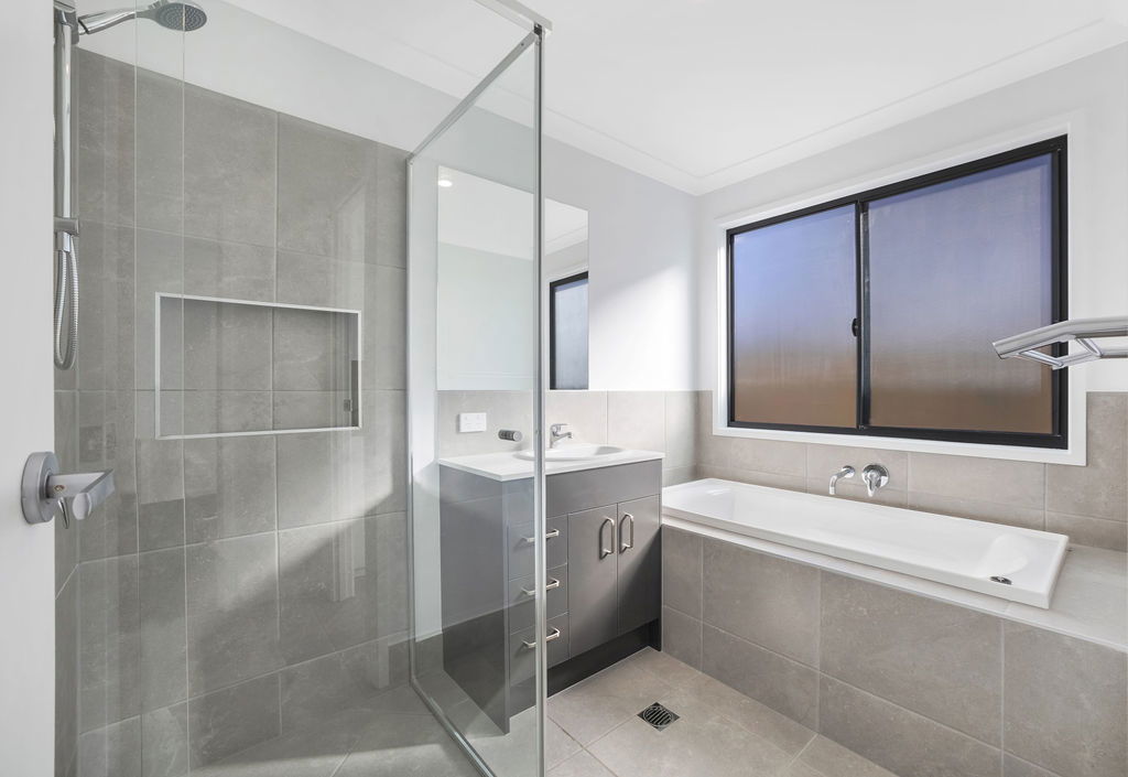 # Family Bathroom with ample storage to vanity and large shower cavity – Separate bathtub.