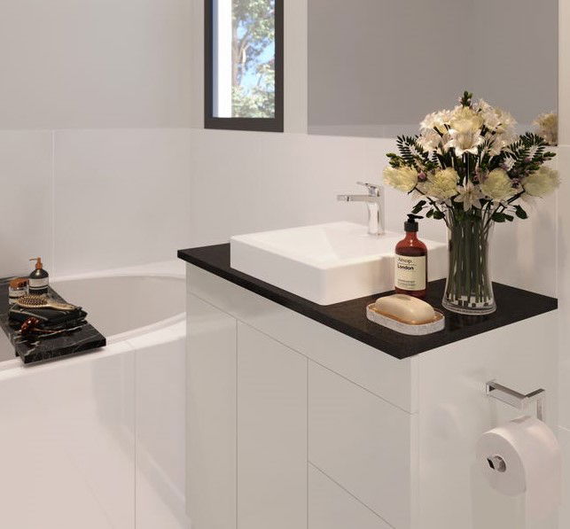 # Main bathroom with shower cavity and SEPARATE BATHTUB. Storage to vanity.