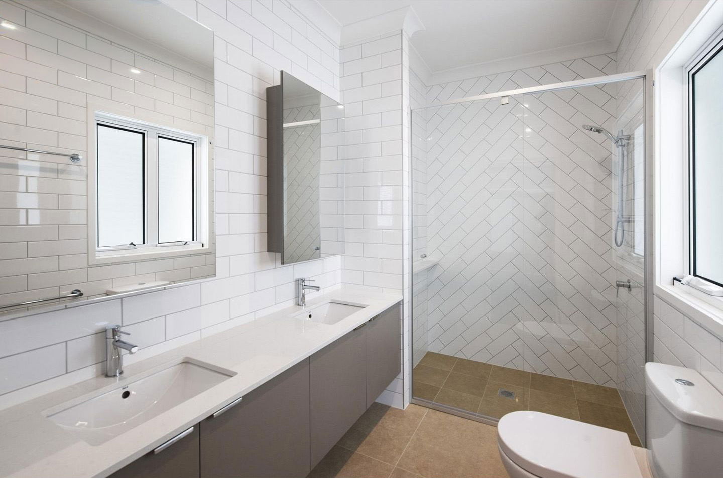 # Ensuite with HIS & HERS sink basins and AMPLE STORAGE to vanity. LARGE shower cavity with stone shelving.