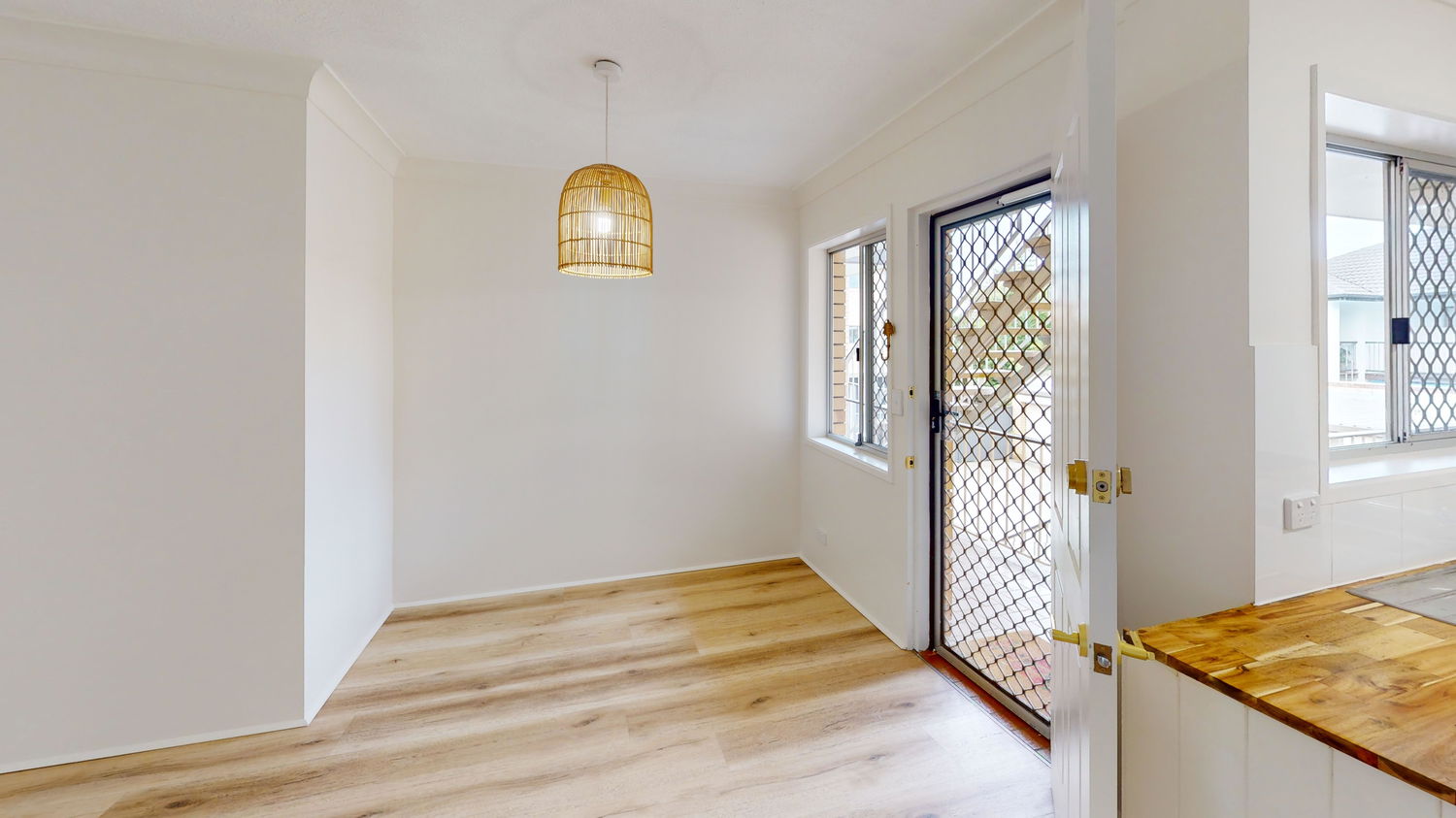 Fresh light colour scheme throughout, the apartment has been updated with thoughtful coastal touches, including brushed brass fittings and rattan light fittings.