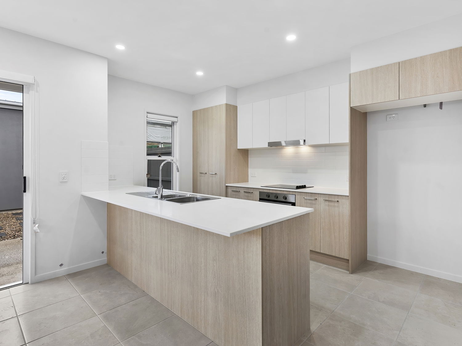 # Sleek and modern kitchen with ample bench and cupboard space featuring stone bench tops, stainless steel appliances including 4-point electric induction stovetop, electric oven, rangehood, and dishwasher.