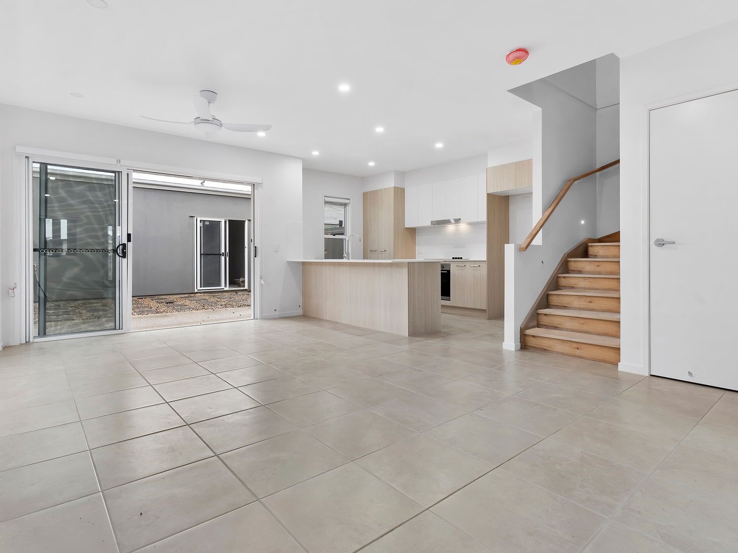 # Open plan kitchen and living room with ceiling fan and air-conditioning.