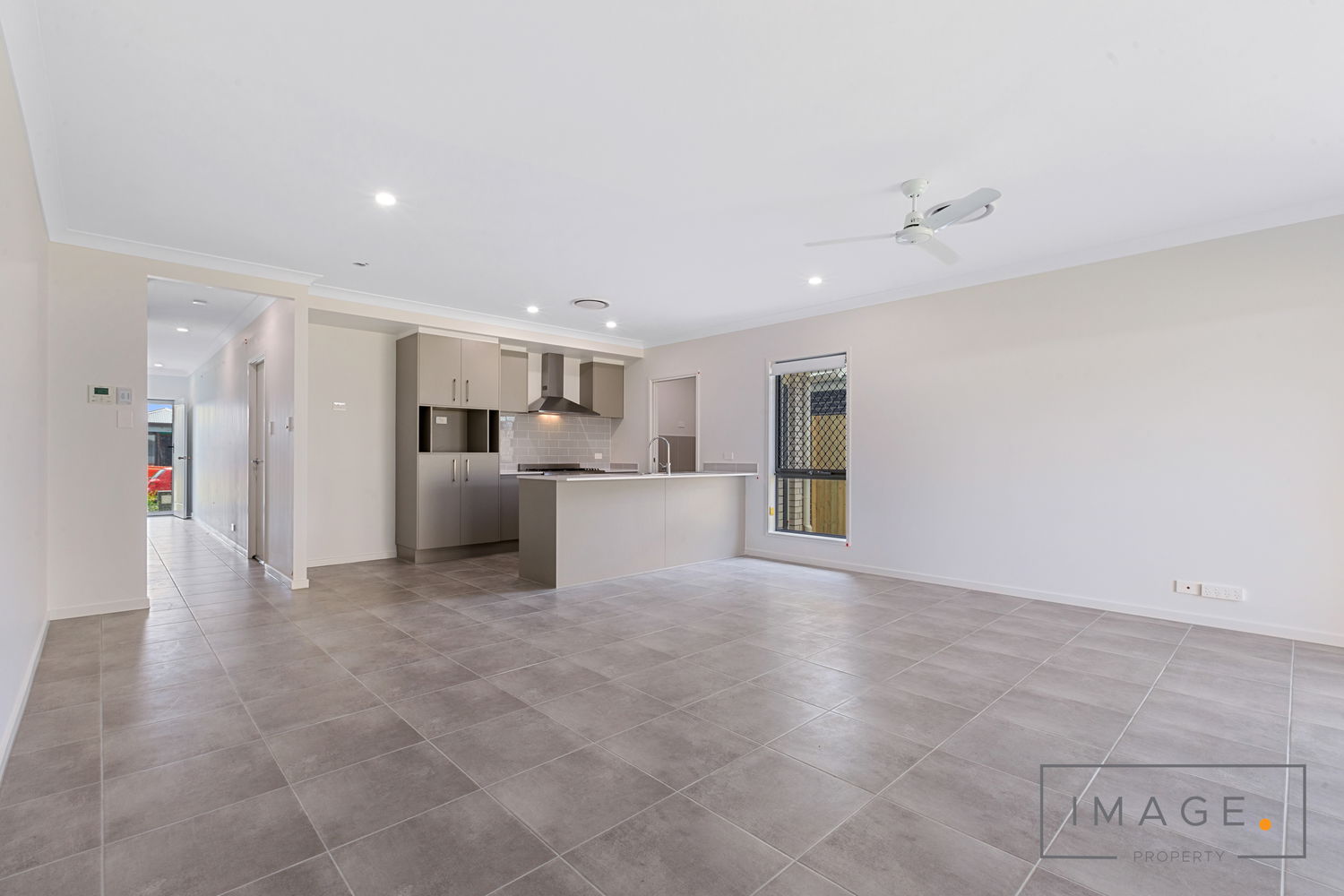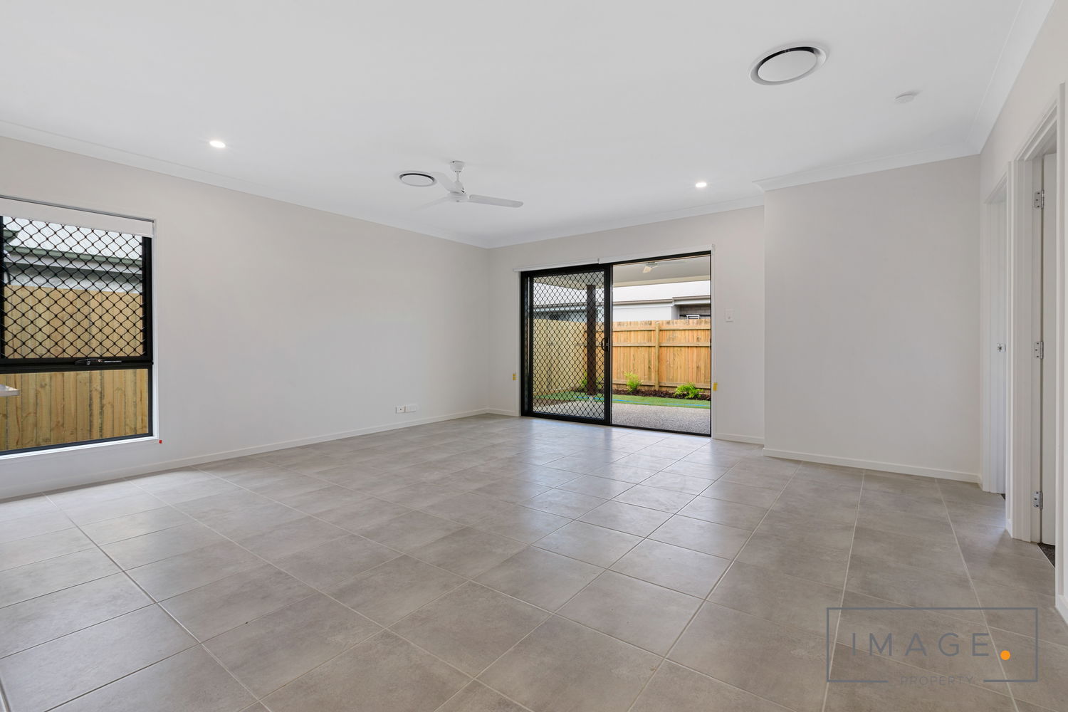 # Large open plan tiled living and dining with ducted air conditioning and ceiling fan opening to large covered entertaining area