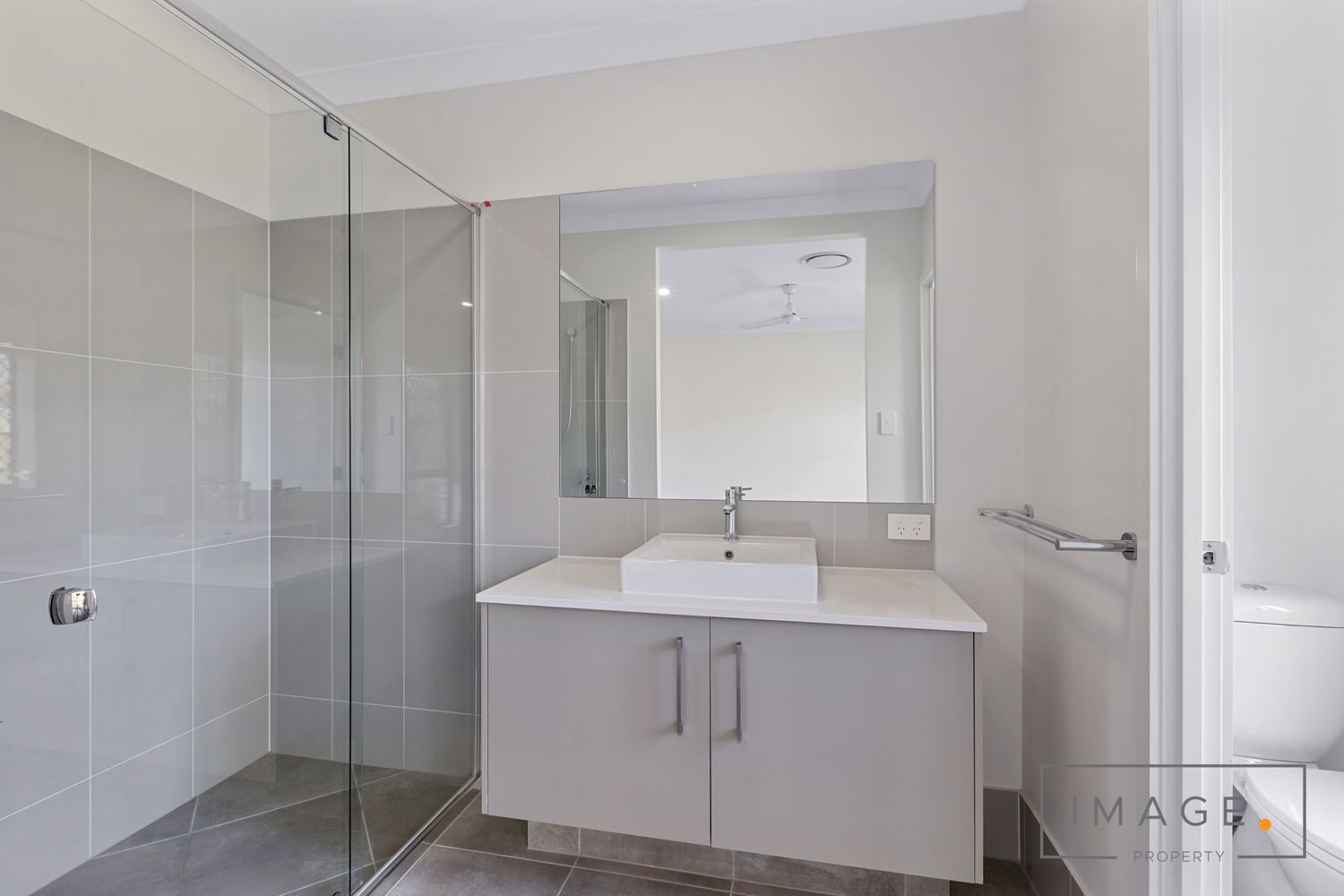 # Ensuite with large shower cavity and ample storage to vanity.