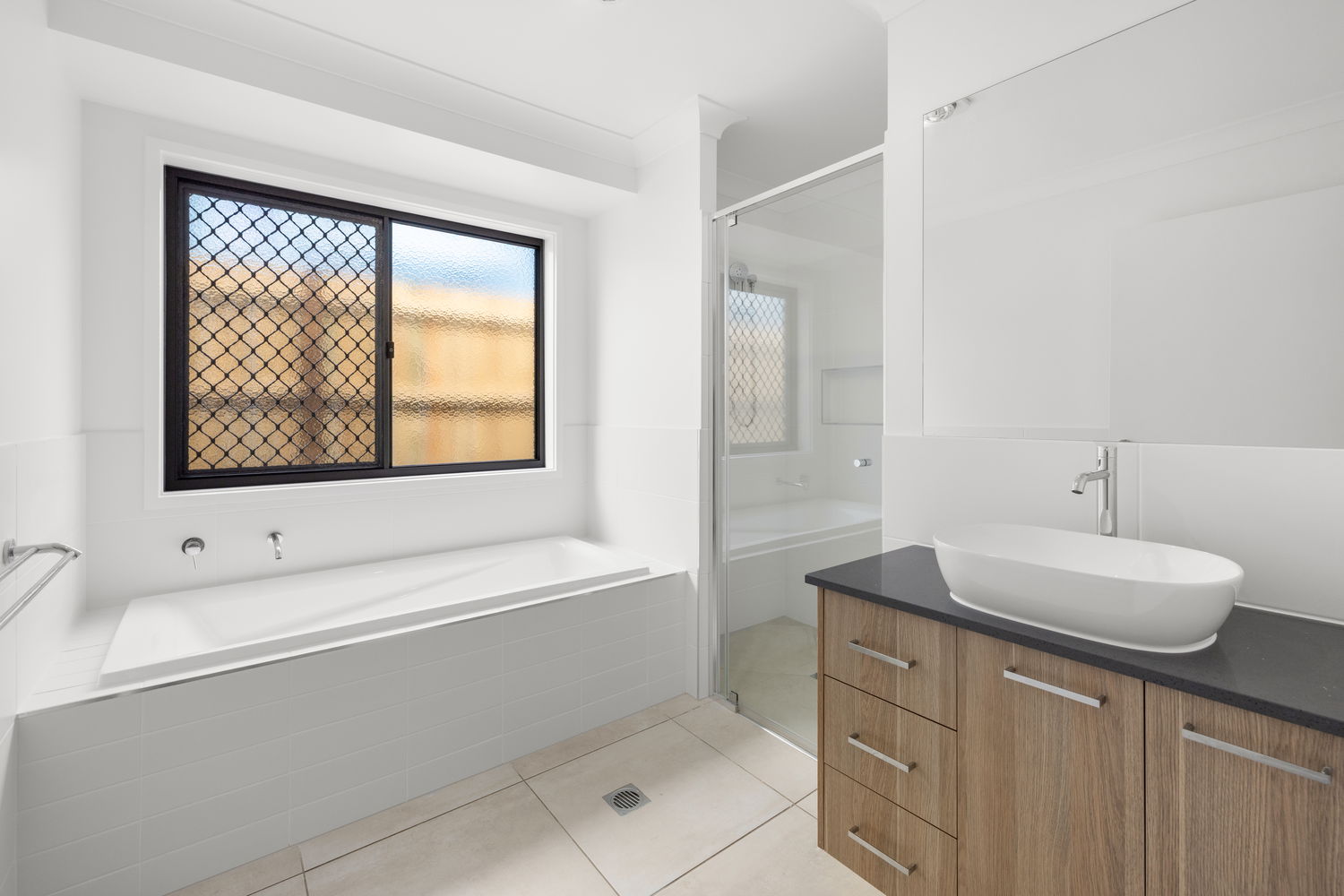 # Family Bathroom with ample storage to vanity and large shower cavity – Separate bath tub.