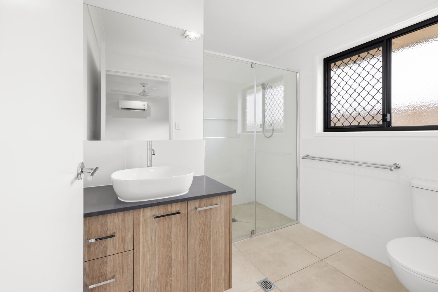 # Ensuite with large shower cavity and ample storage to vanity.