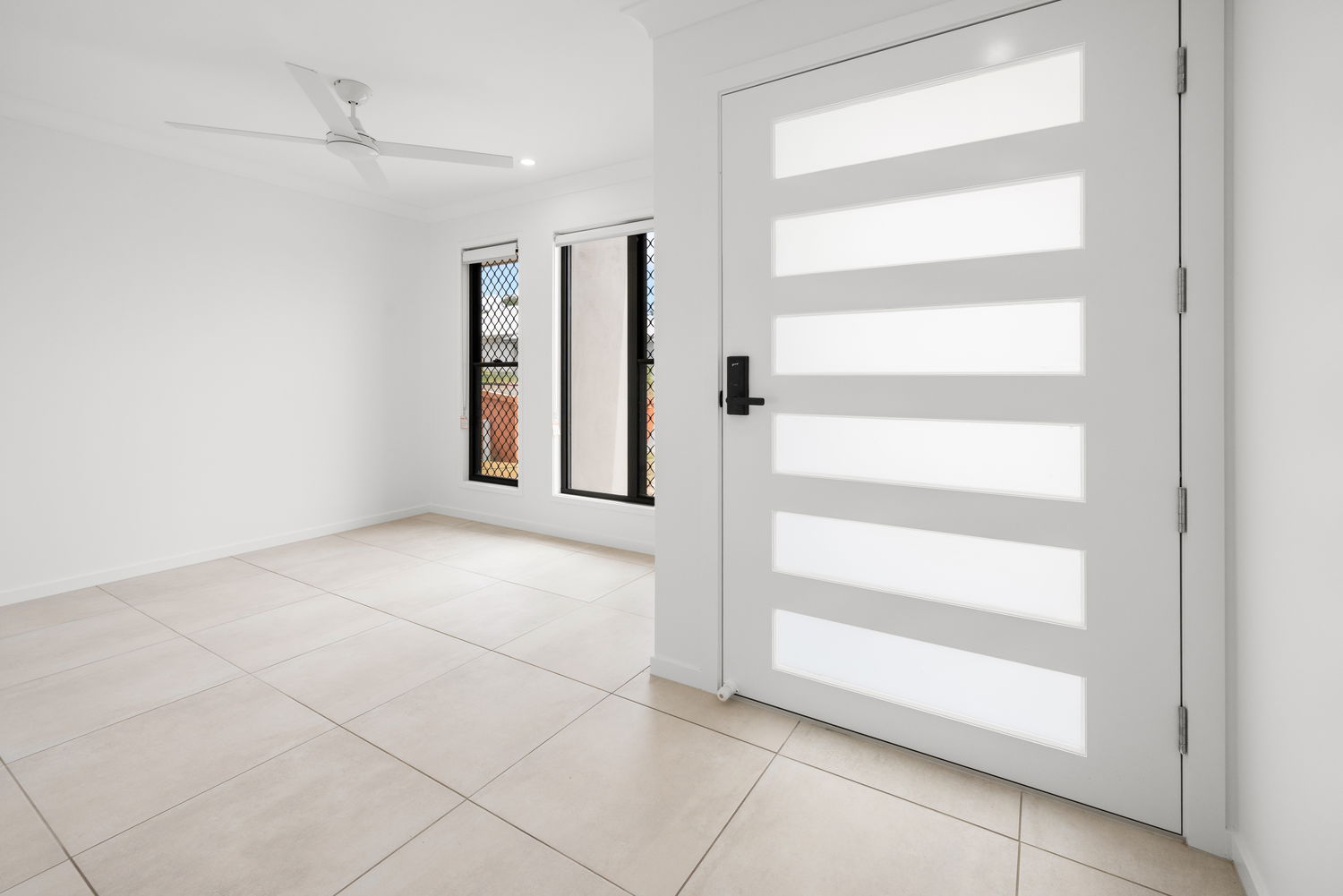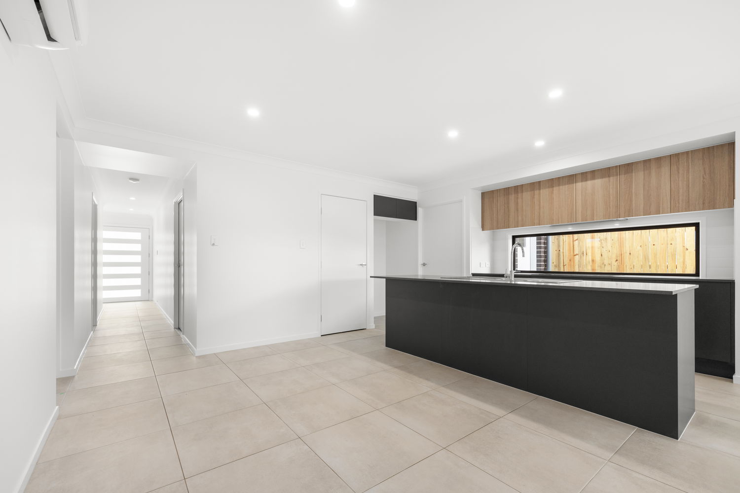 # Open plan tiled living and dining with air-conditioning and ceiling fan opening to covered entertaining area.