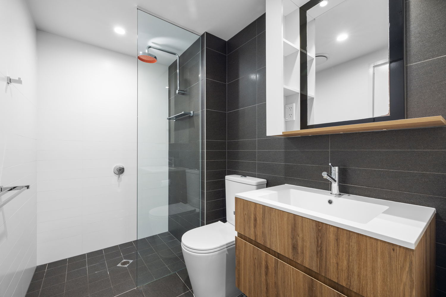 # Bathroom features large shower, toilet and ample space to vanity
