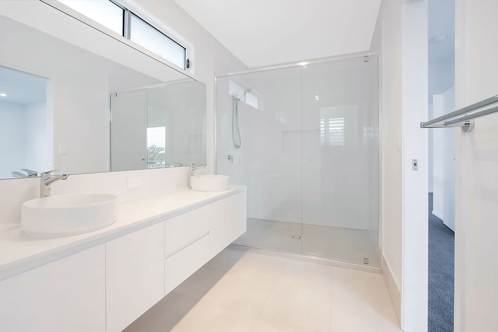 # Ensuite with huge shower cavity, double basins, separate toilet and ample storage to vanity.