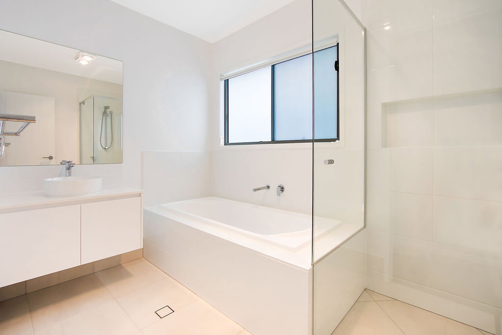 # Main family bathroom with ample storage to vanity and large shower cavity and separate bathtub