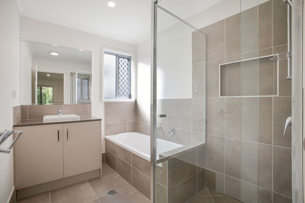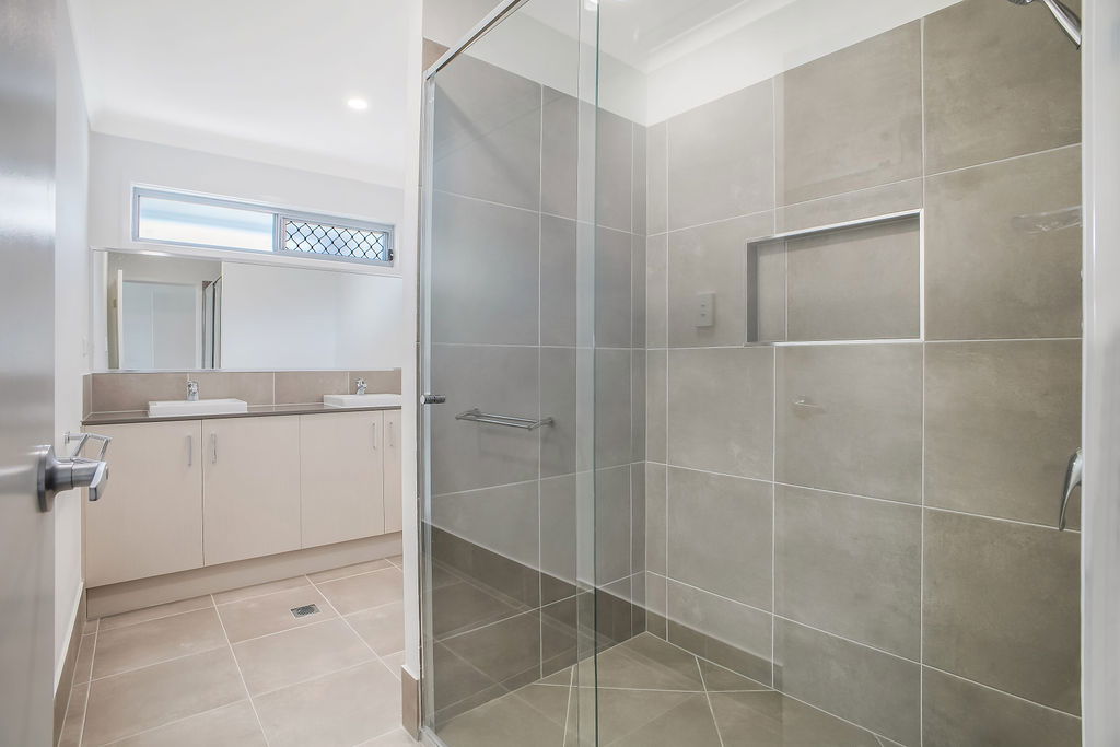 # Ensuite with large shower cavity, double basins and ample storage to vanity.