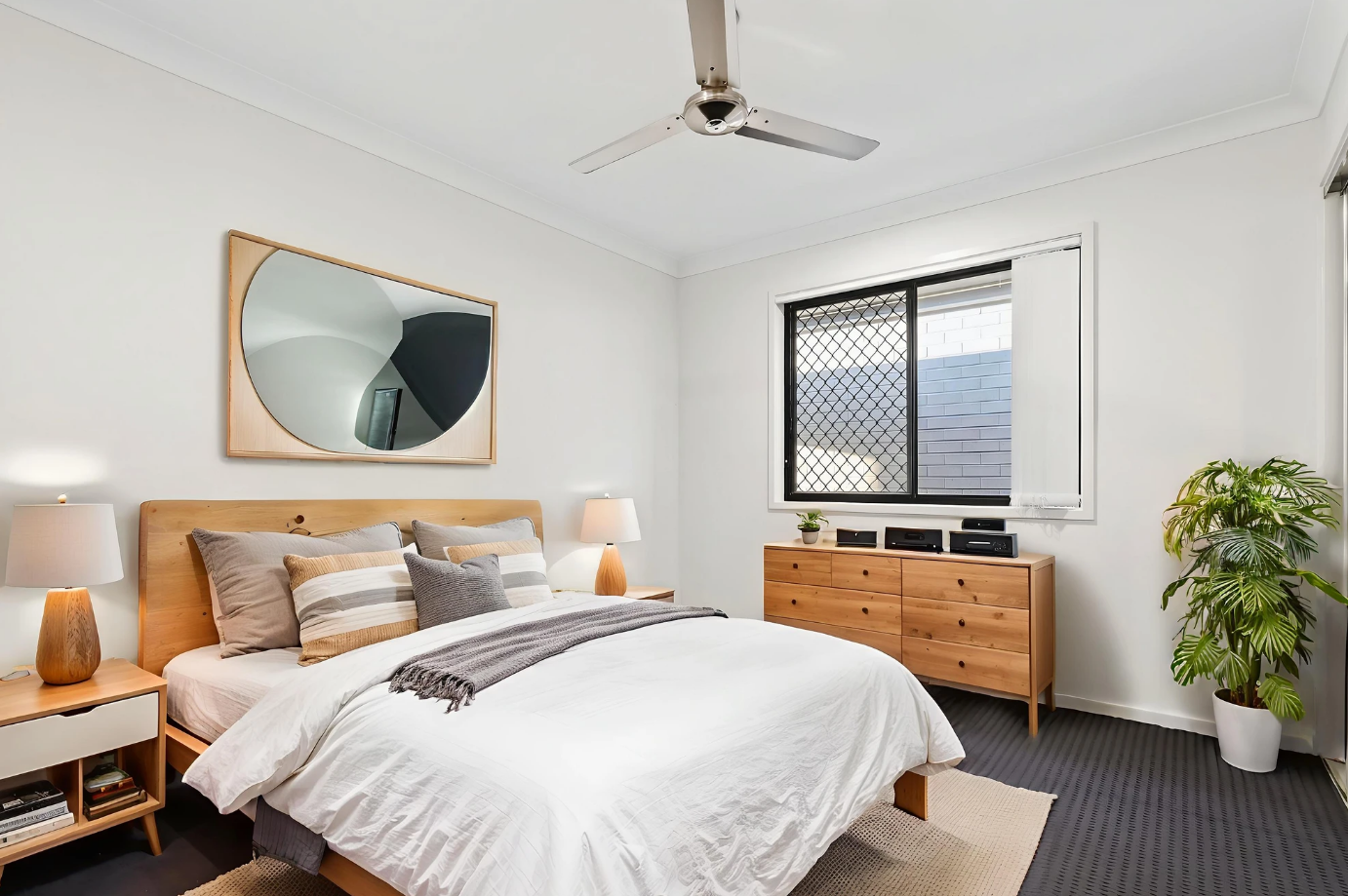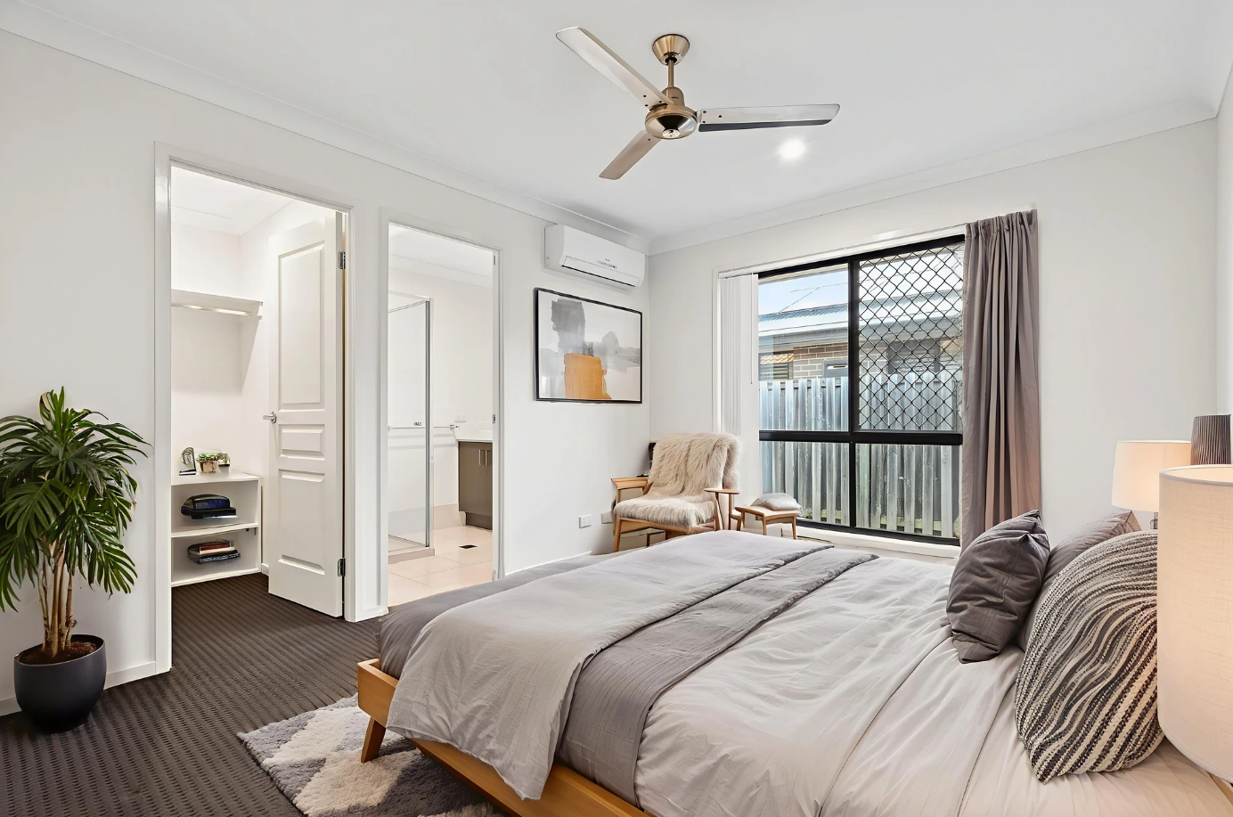 # Master bedroom featuring air-conditioning, ceiling fans, walk-in robe and private ensuite.