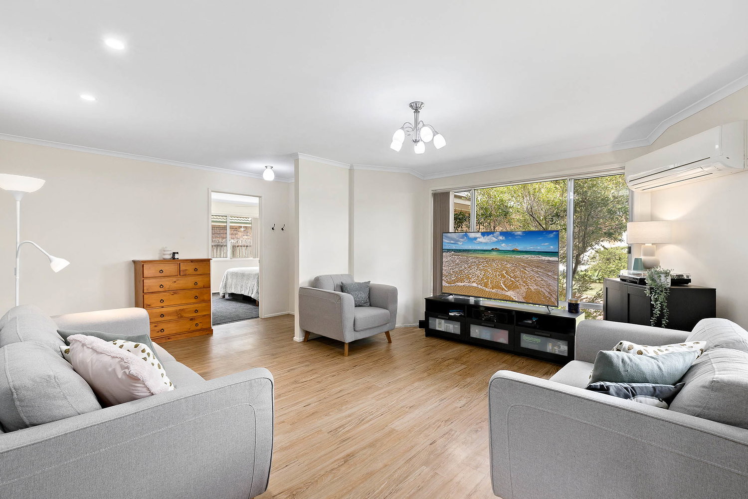 # Living space with plenty of natural light, ceiling fans and air-conditioning.