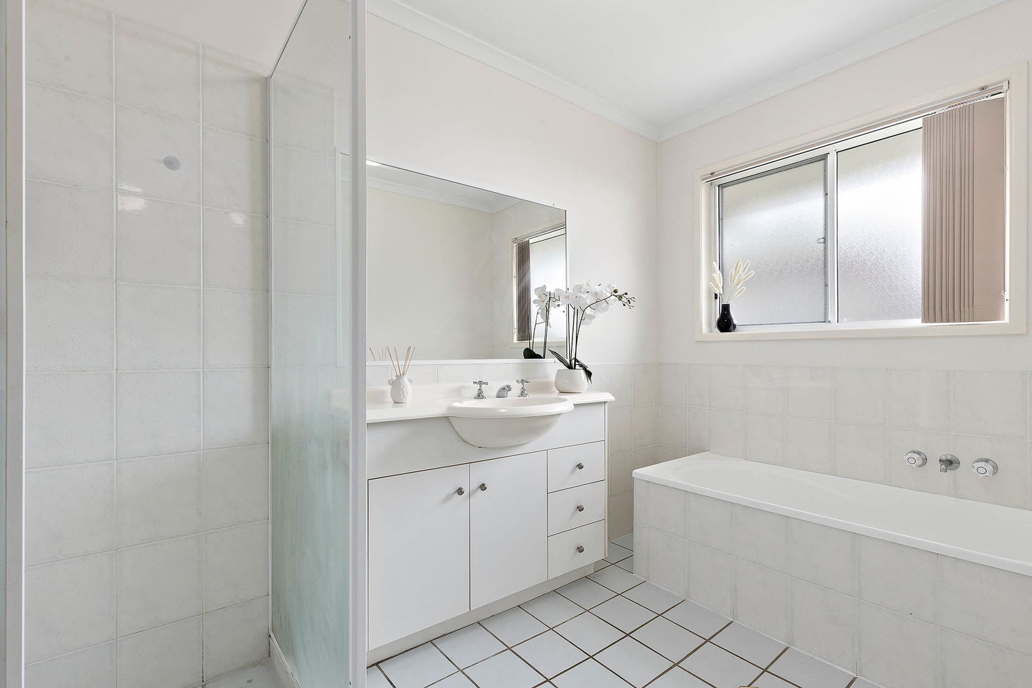 # Main bathroom with large shower cavity, ample storage to vanity and separate bath