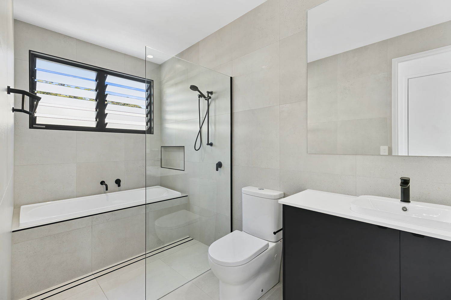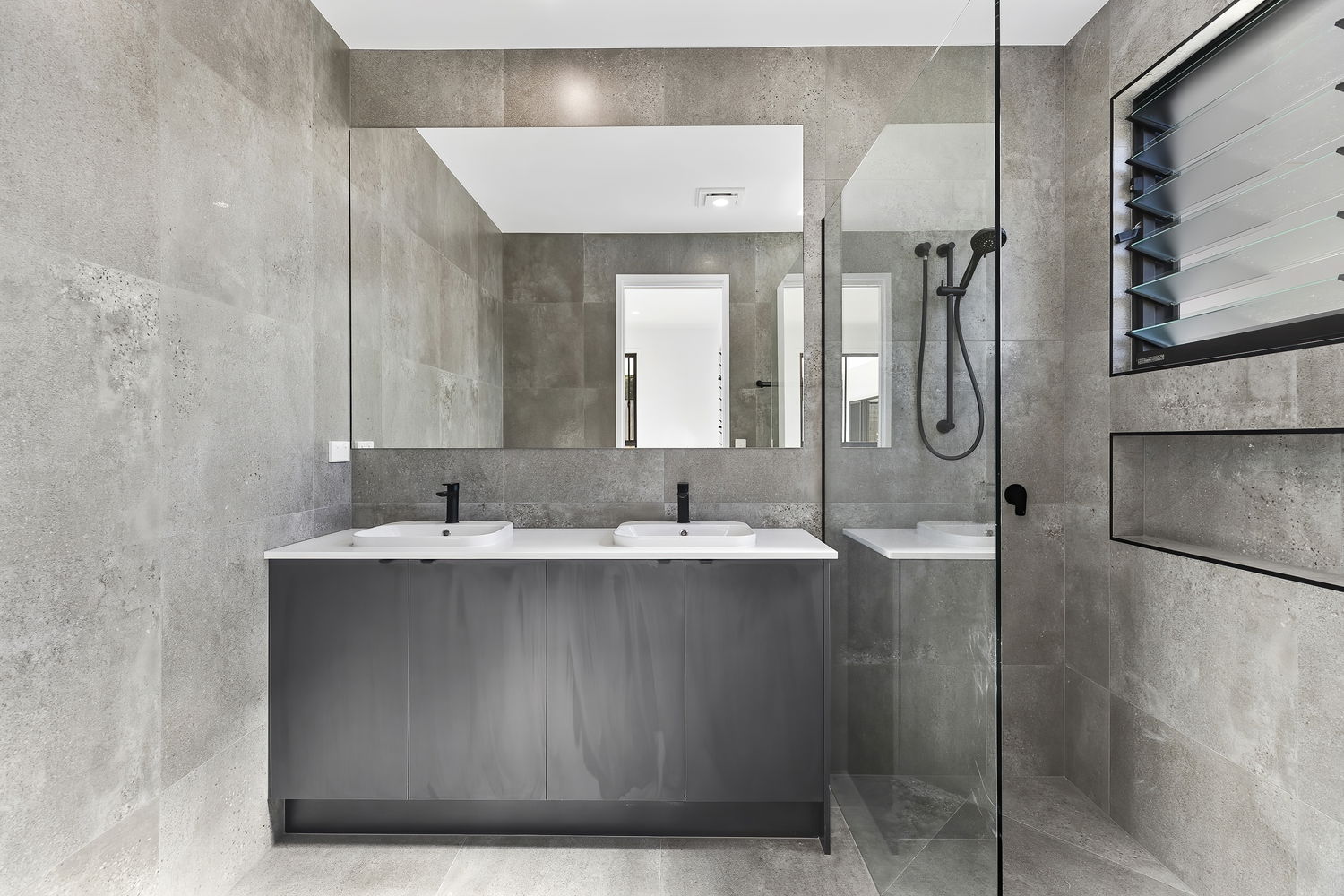 # Master bedroom with walk in robe and stylish ensuite overlooking the outdoor pool area