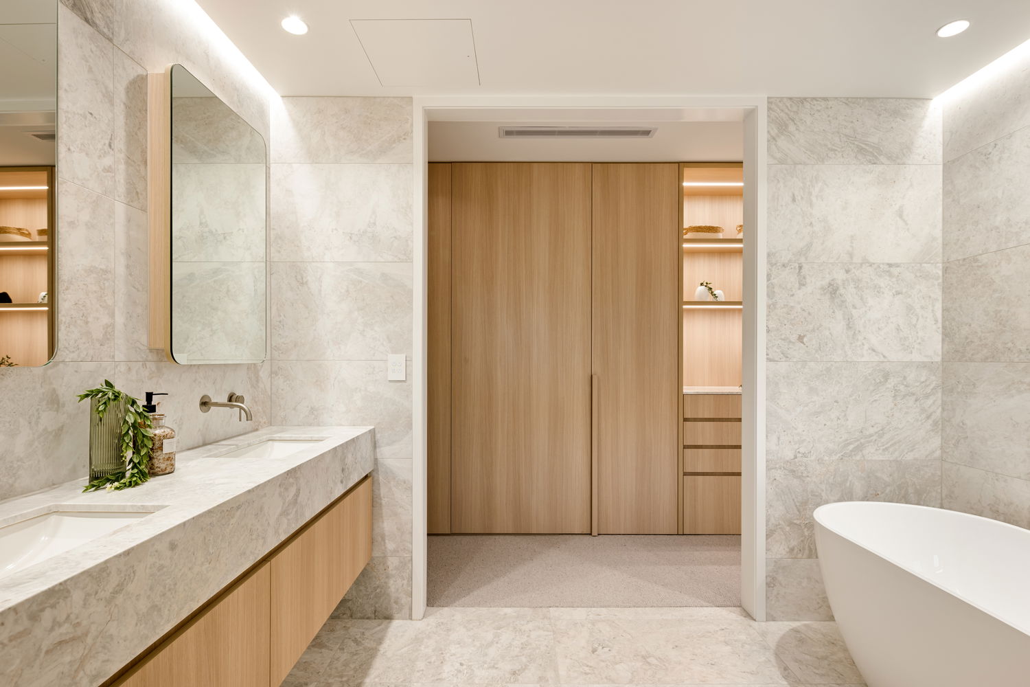 # Master suite boasts uninterrupted North East river views, his and hers wardrobes, makeup station with LED lighting, plush carpet and the opulent ensuite with floor to ceiling marble tiles deep soak freestanding bath, double vanity and large shower