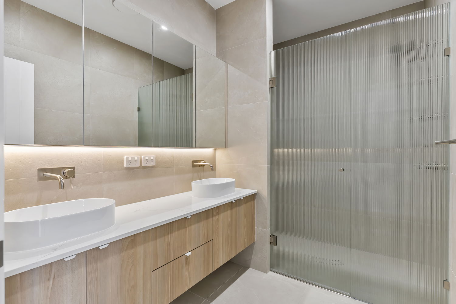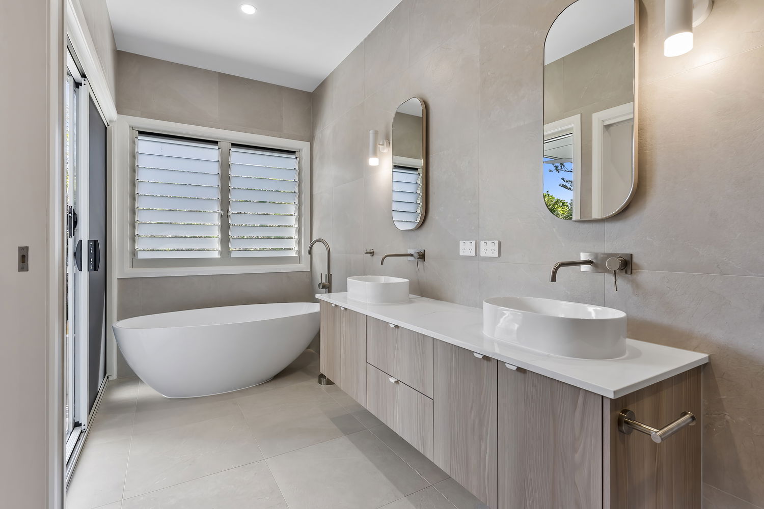 # Private ensuite with dual basin, separate bath and shower and designer finishes