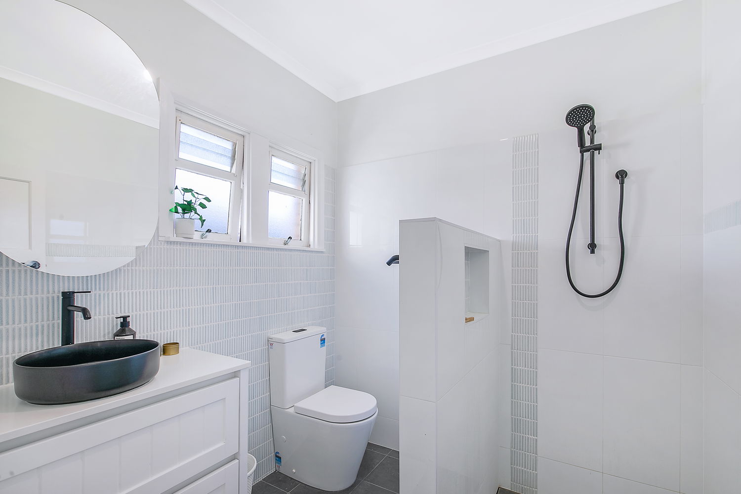 # Second bathroom renovated with ample storage to vanity, shower with niche, black finishings and toilet