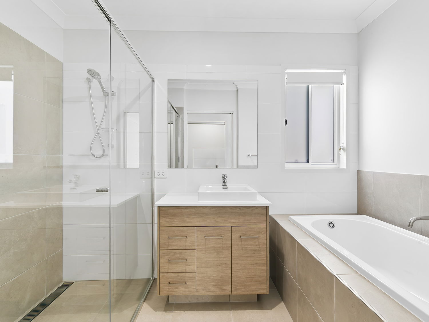 # Sleek bathrooms including a built-in bathtub in the main bathroom.