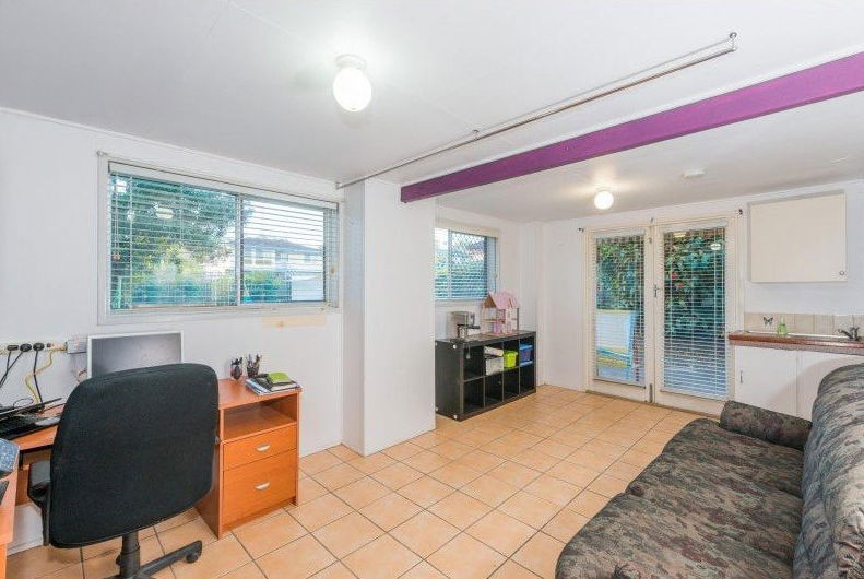# Downstairs tiled rumpus room/bedroom with walk in robe and kitchenette sink