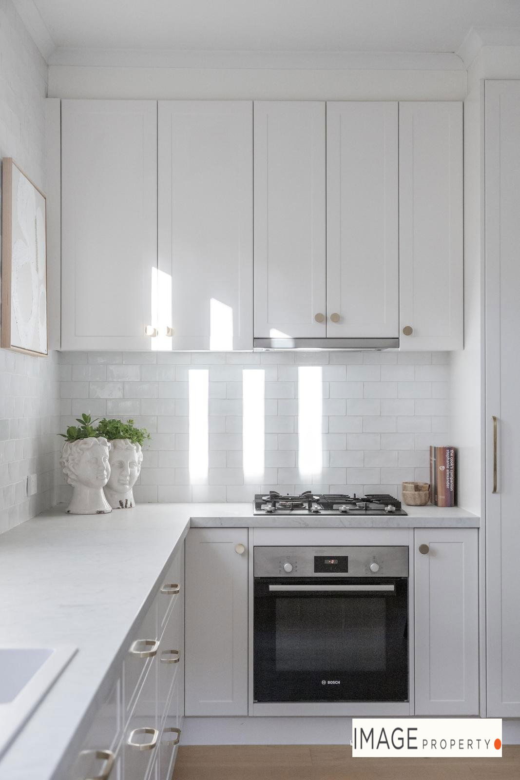 The beautifully appointed kitchen boasts elegant soft-close 2-pac cabinetry, stone benchtops, and quality Bosch appliances including an integrated dishwasher and gas cooktop, all overlooking the leafy garden with space for dining.