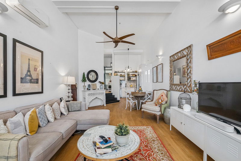 #Elegant Open Living: Soaring ceilings, timber flooring, and an abundance of natural light define the open-plan living and dining area, flowing seamlessly into a second sun-drenched living space with elevated city views, perfect for relaxing or entertaining.