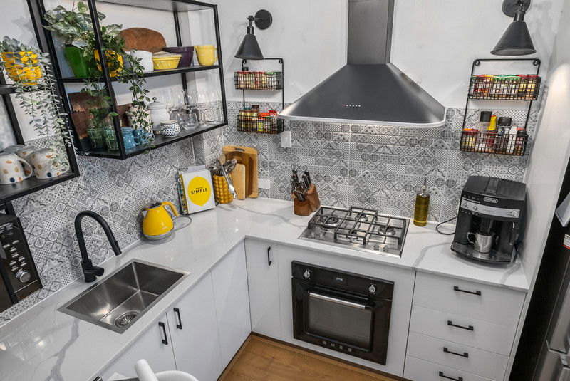 #Designer Kitchen: Upgraded with high-quality fixtures, sleek stone benchtops, gourmet appliances, feature tiling, matte black shelving, and pendant lighting, providing a stylish and practical hub for daily living.