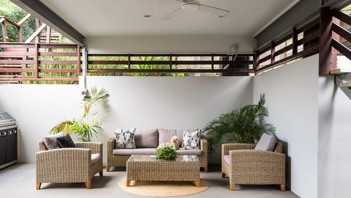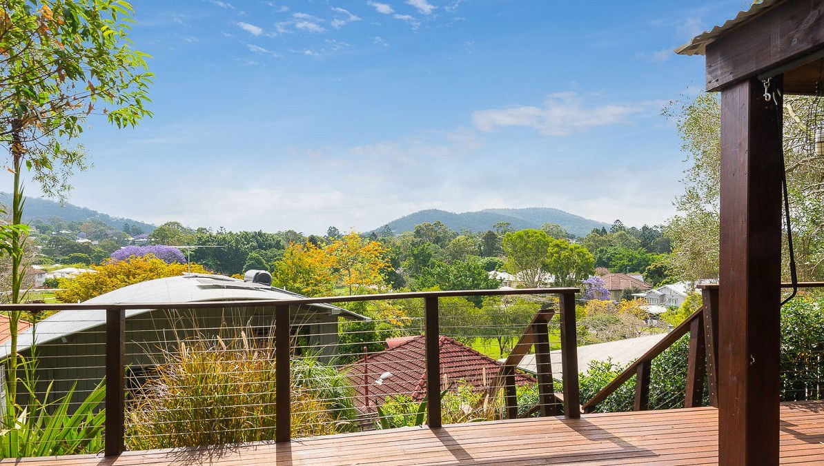 # Covered upper deck with leafy views to Mount Coot-tha