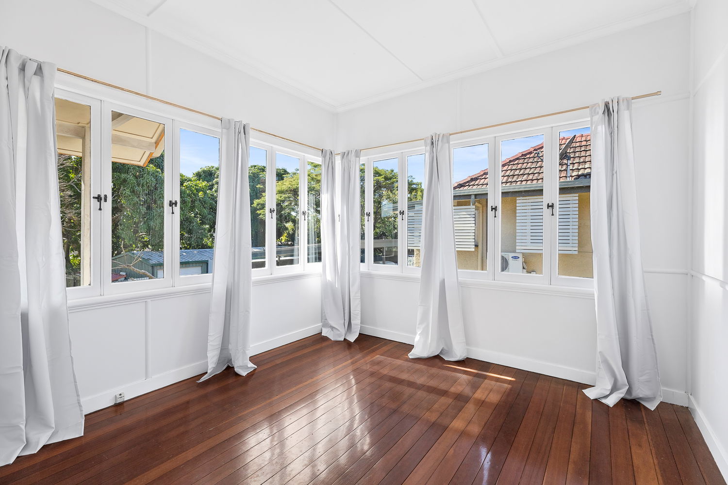 # Open plan living area with timber floorboards and air-conditioning