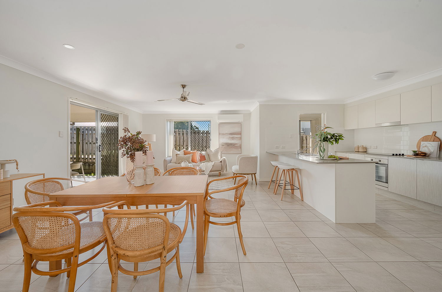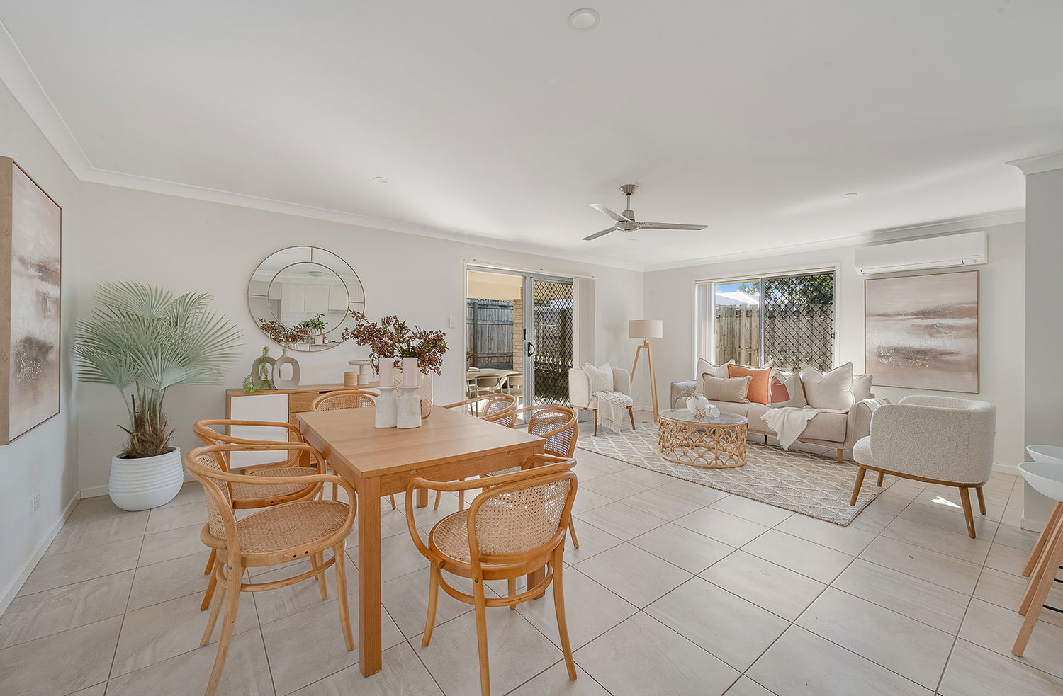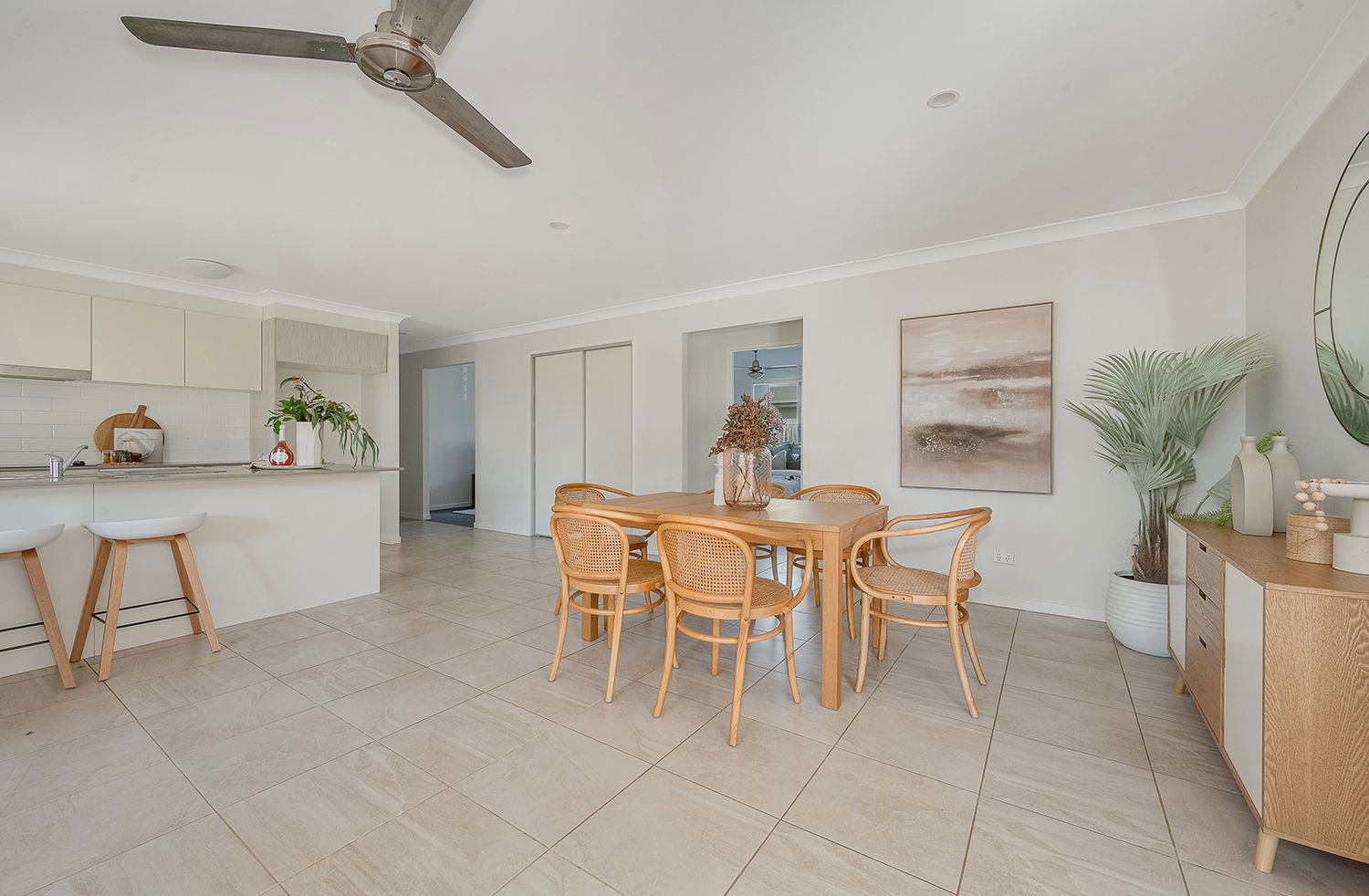 # Spacious open plan living and dining including ceiling fans and air-conditioning. Opening onto the covered alfresco space, perfect for entertaining.